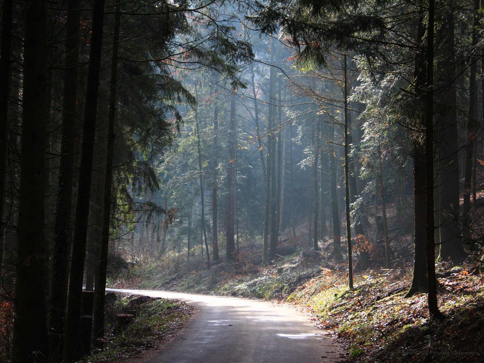 Die Sonne scheint schräg auf die Fahrstraße zum Holzweiher. |