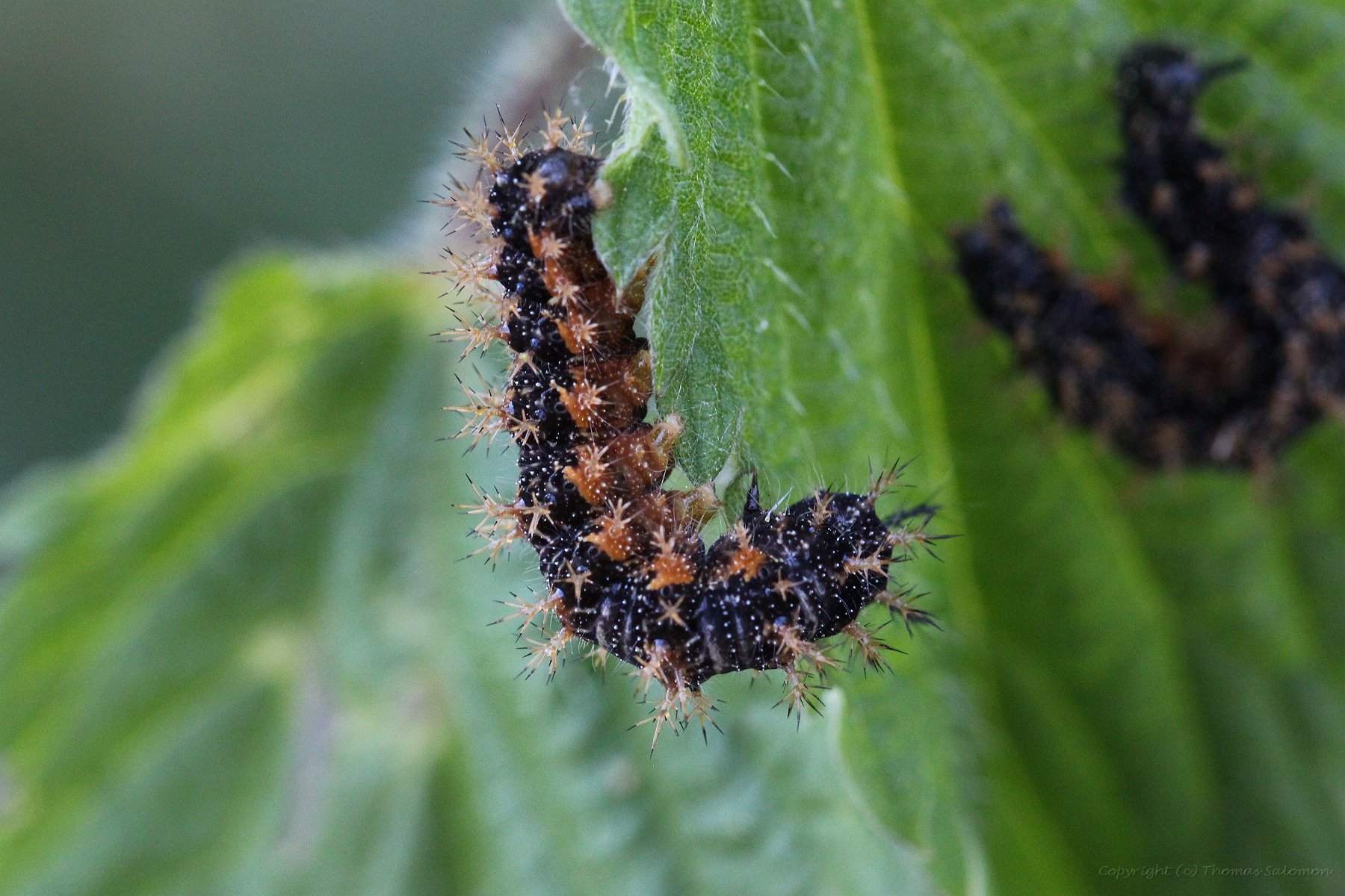 Eine weitere Raupe eines Landkärtchens (Araschnia levana) - bei diesem Exempülar ist die braune Unterseite gut erkennbar - und sie hat braune Borsten.