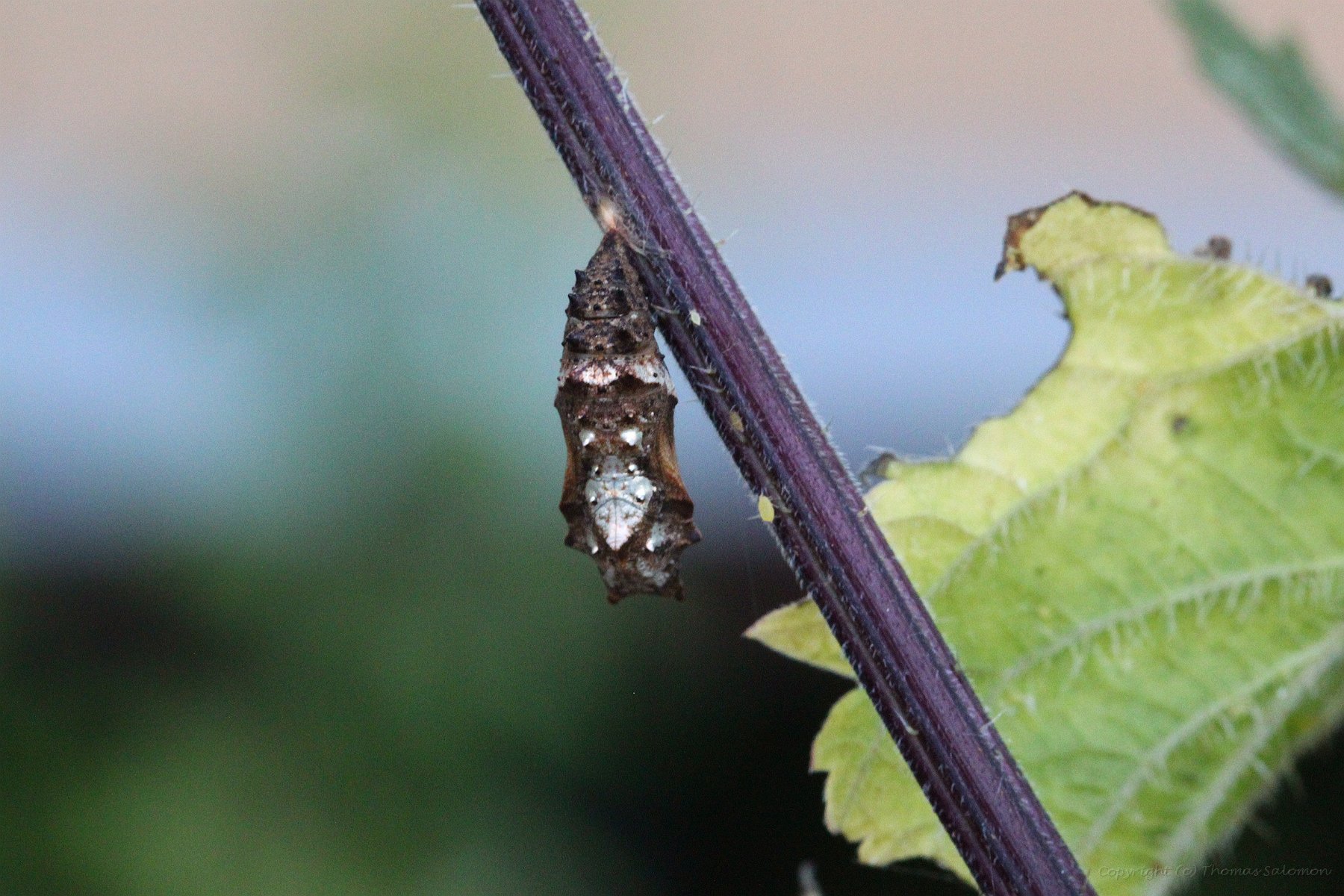 Die Puppe eines Landkärtchens (Araschnia levana) - hier an Brennessel. Die Puppen sind sehr klein und nur etwa 12-15 mm lang.