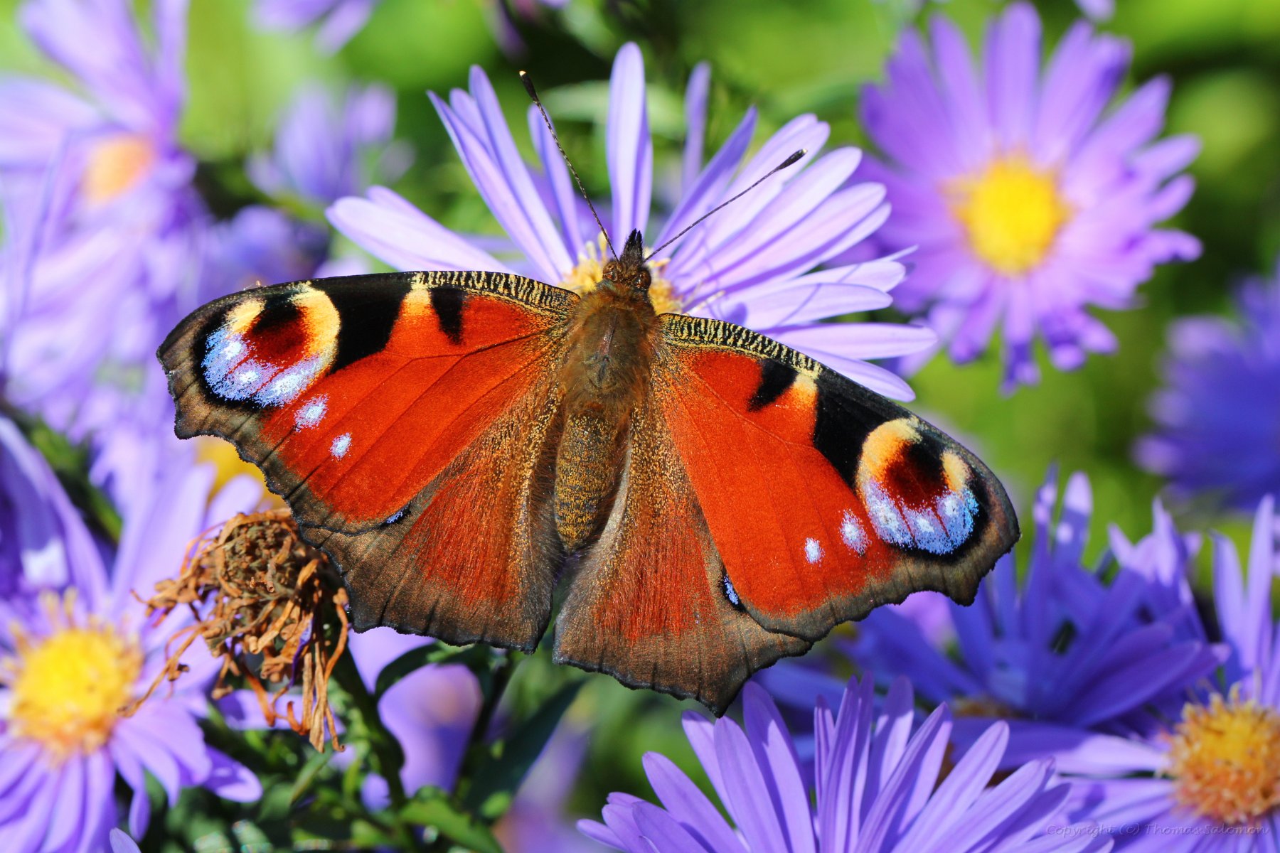 Ich habe das schöne Ergebnis von Aglais io an einer der letzten Blüten eines Sommerflieders abgesetzt.