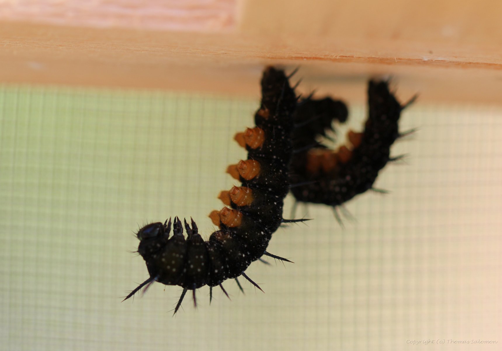 Diese beiden Raupen des Tagpfauenauges haben gerade mit der Verpuppung begonnen.