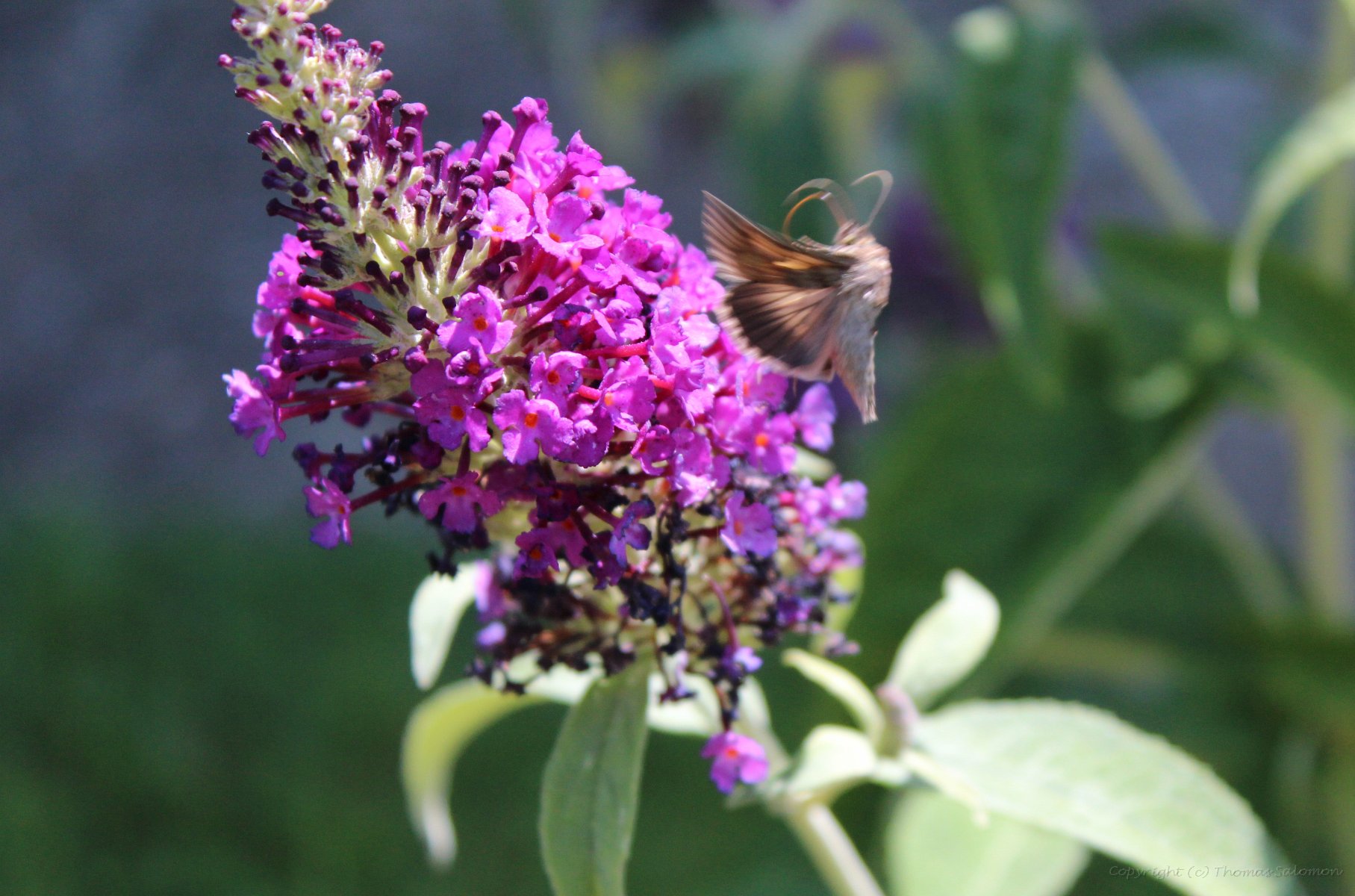 EIne Gammaeule (Autographa gamma) im Anflug auf einen Sommerflieder |