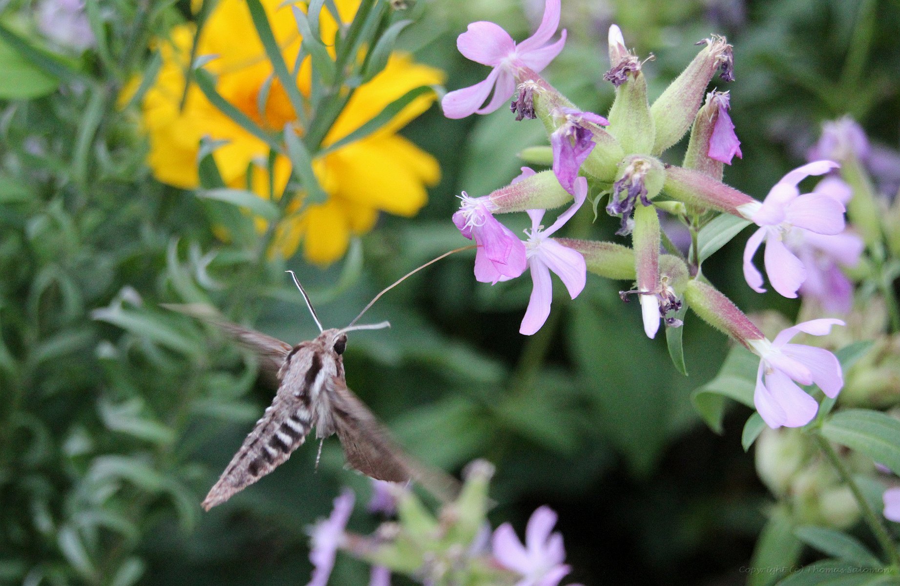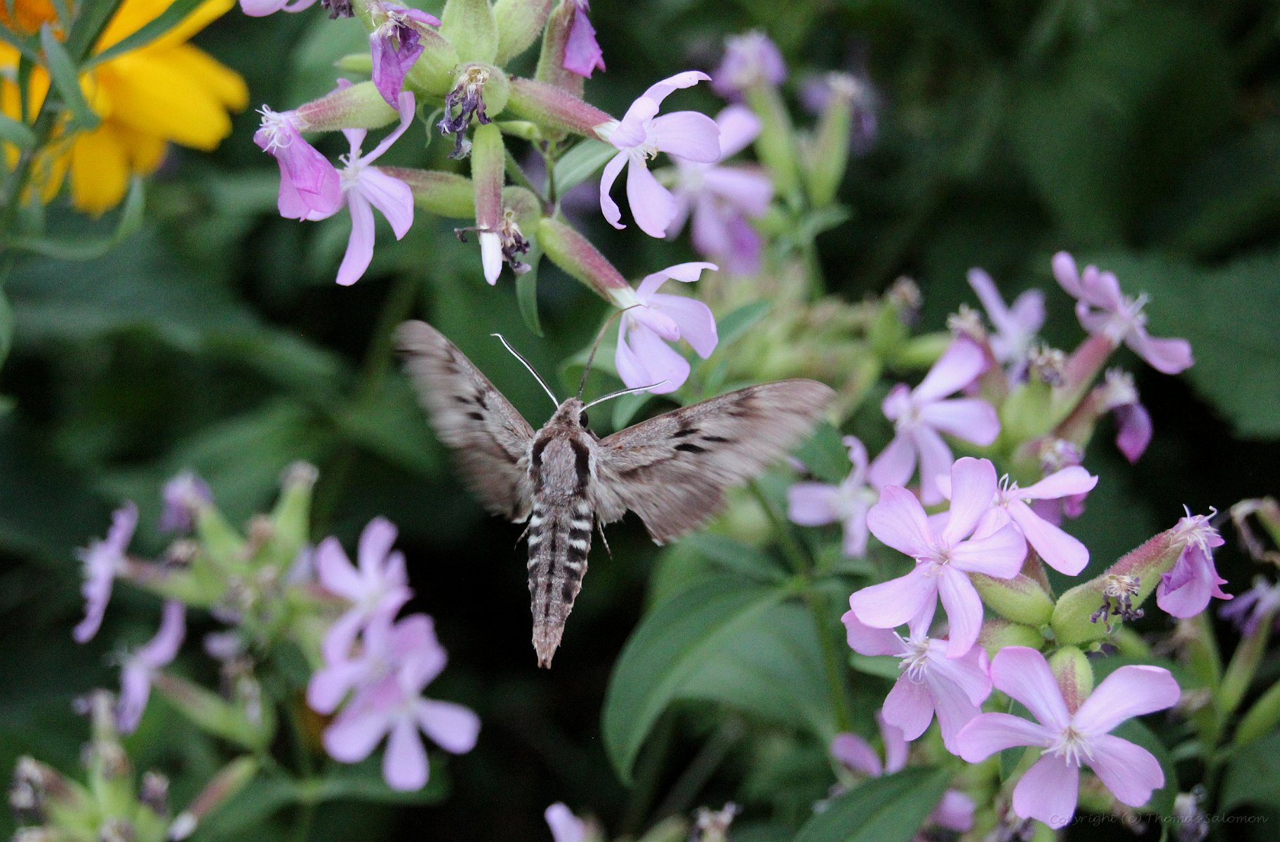 Kiefernschwärmer (Sphinx pinastri) beim Anflug an Seifenkraut |