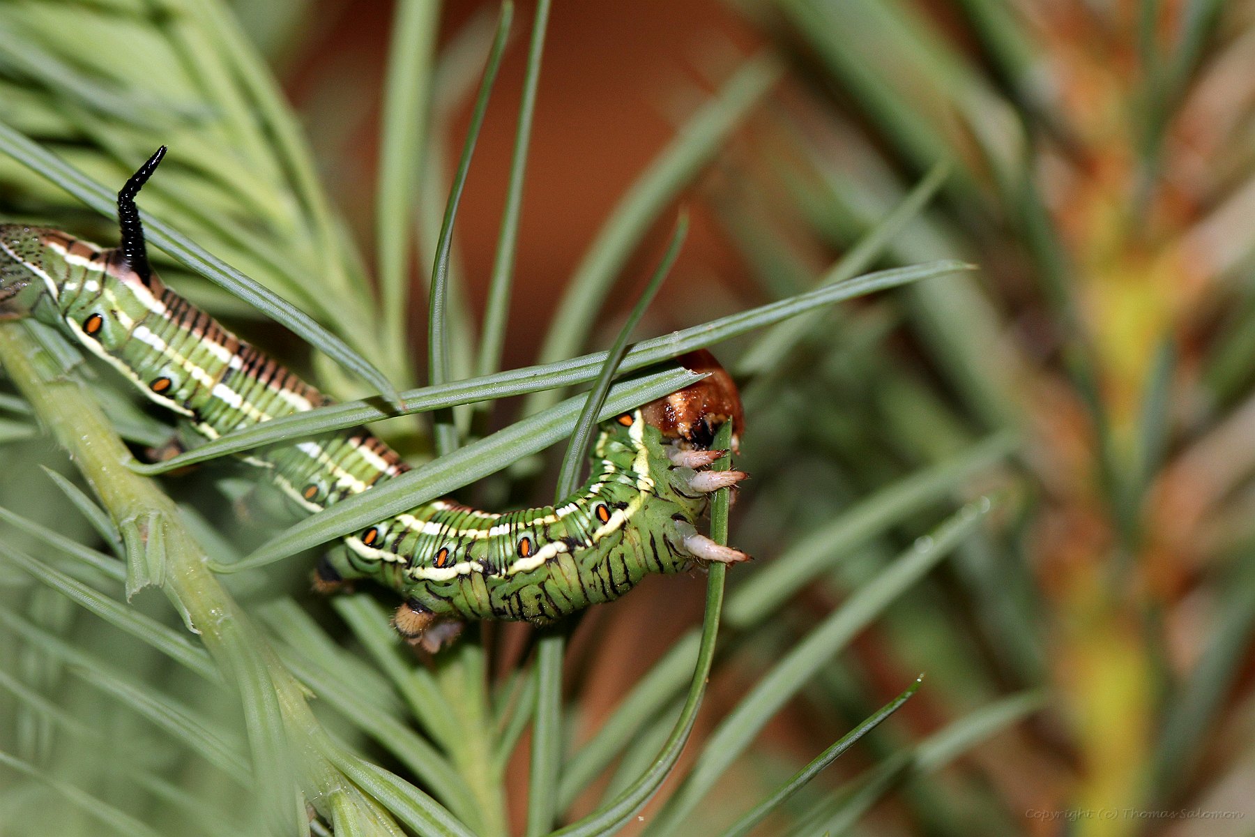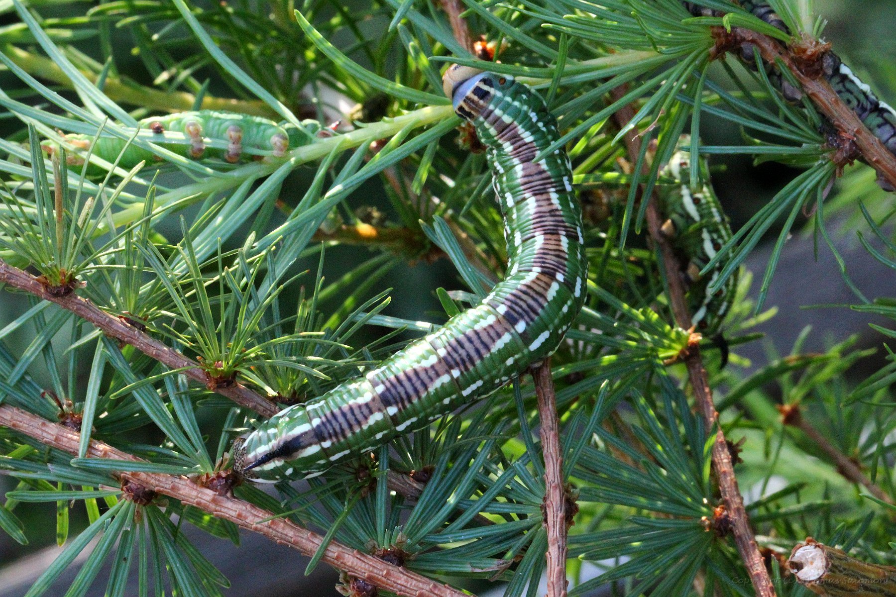 L2-Raupen des Kiefernschwärmers (Sphinx pinastri) an Lärche. |