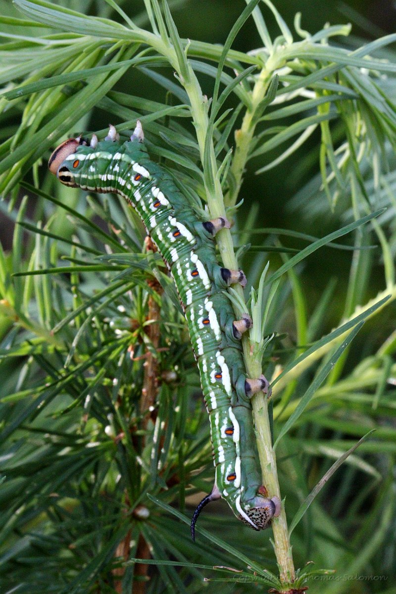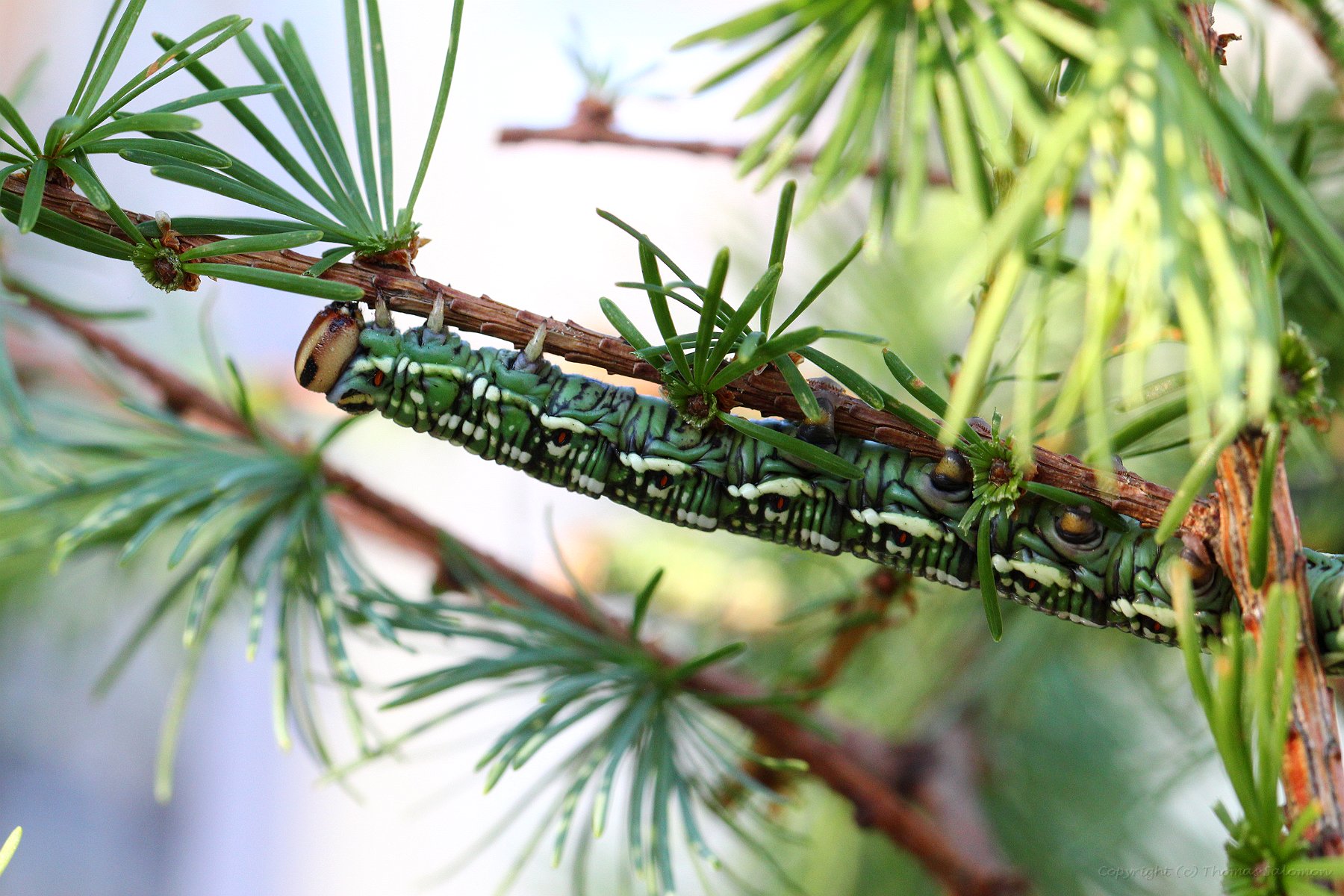 Eine L4-Raupe des Kiefernschwärmers (Sphinx pinastri) beim Fressen an Lärche. |