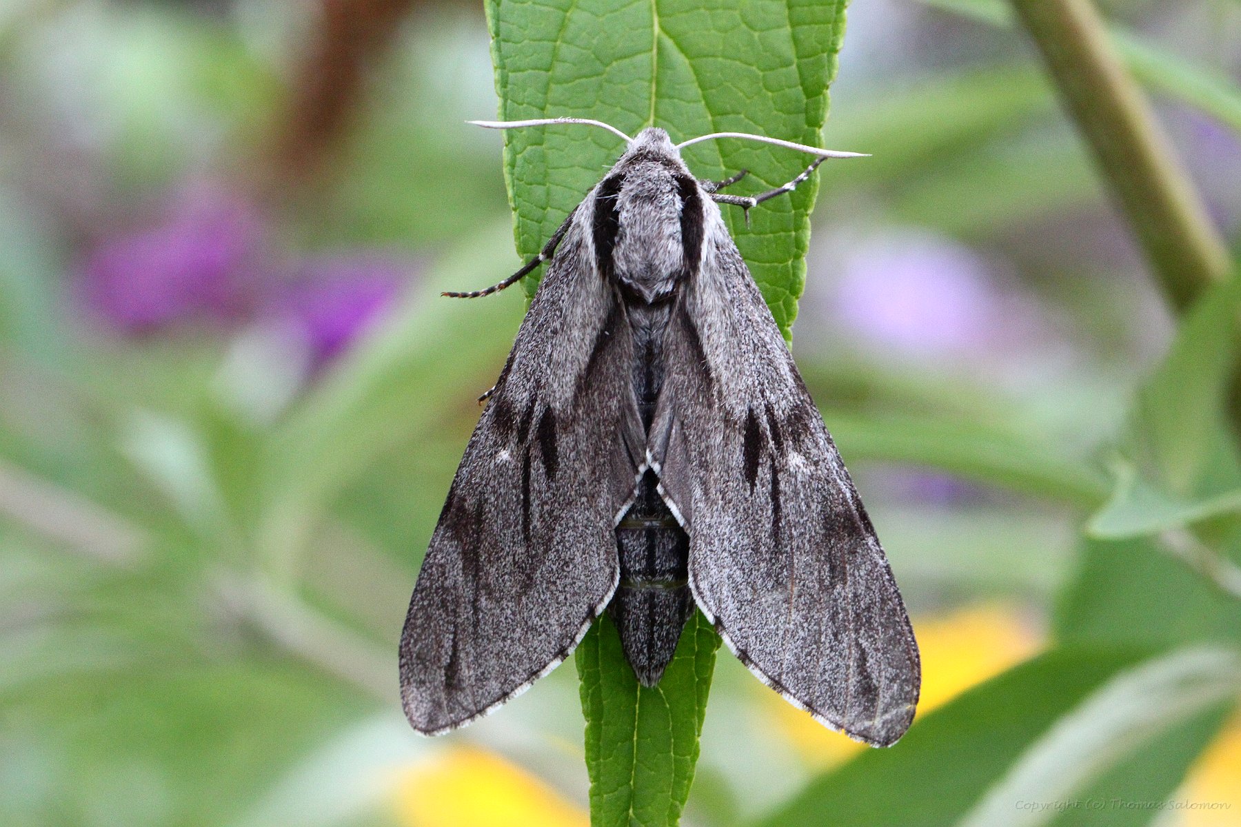Ein Kiefernschwärmer (Sphinx pinastri) - aufgenommen nachts mit Blitz. |