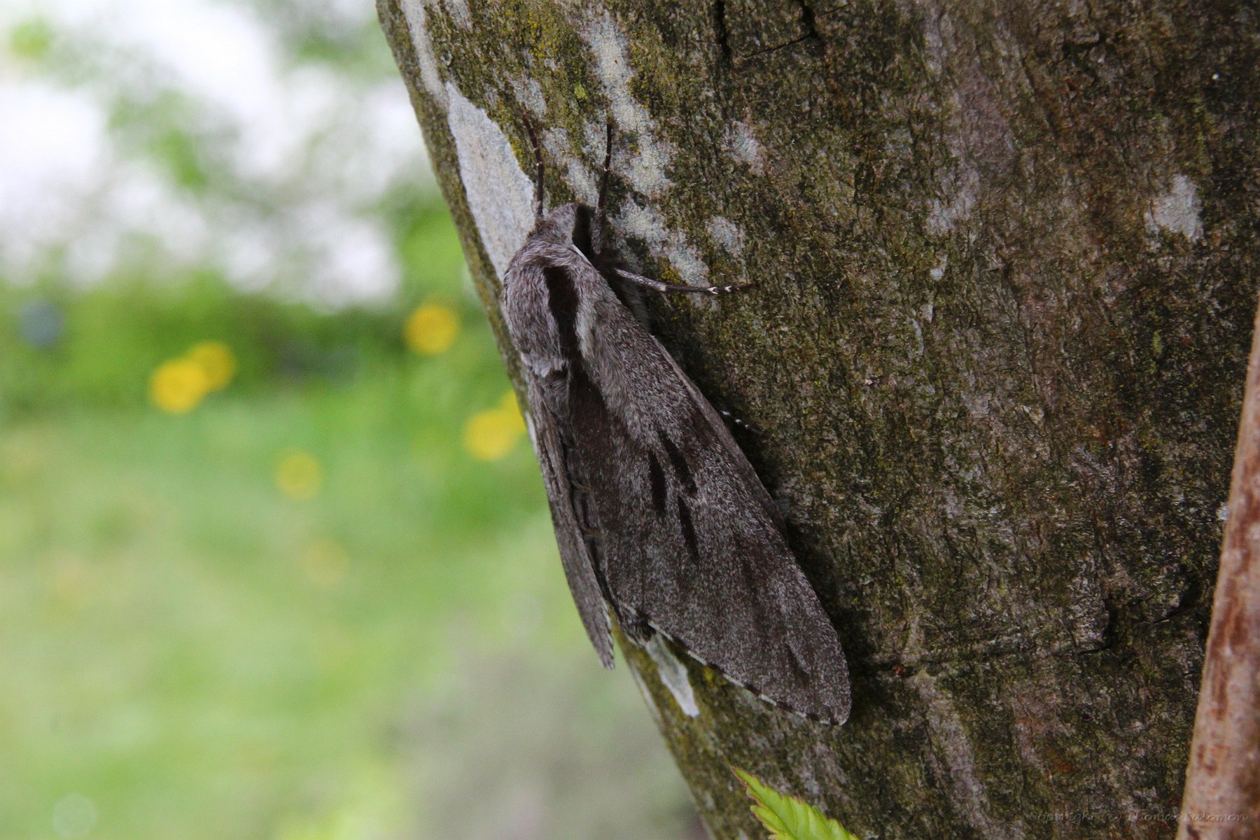 Kiefernschwärmer (Sphinx pinastri) in Ruhe an einem Baumstamm - eine (fast) perfekte Tarnung. |