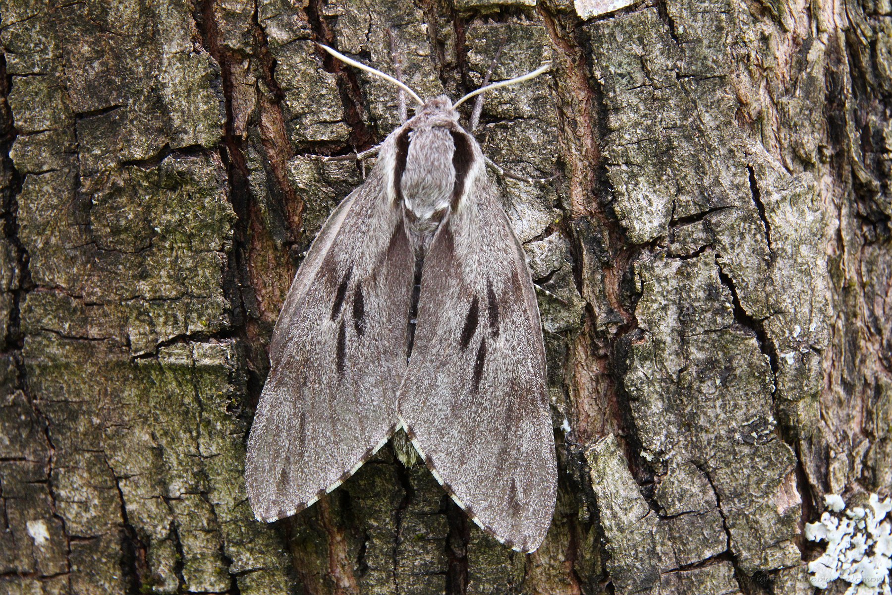 Kiefernschwärmer (Sphinx pinastri) in Ruhehaltung an einem Baumstamm. |