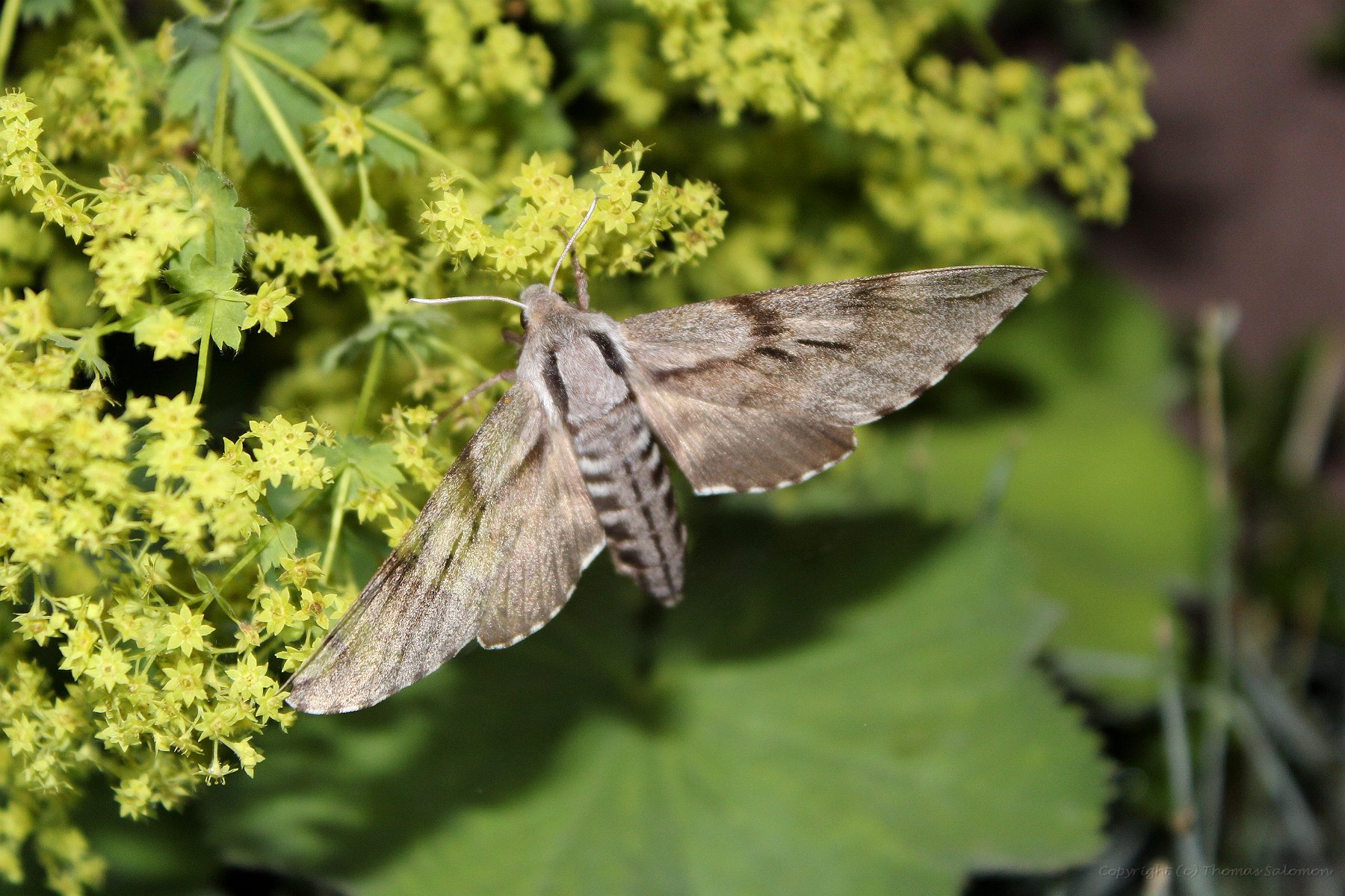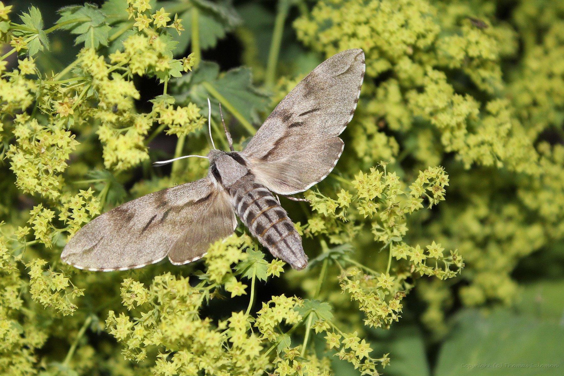Der Kiefernschwärmer oder auch Tannenpfeil (Sphinx pinastri) beim Schwirrflug an Frauenmantel. |