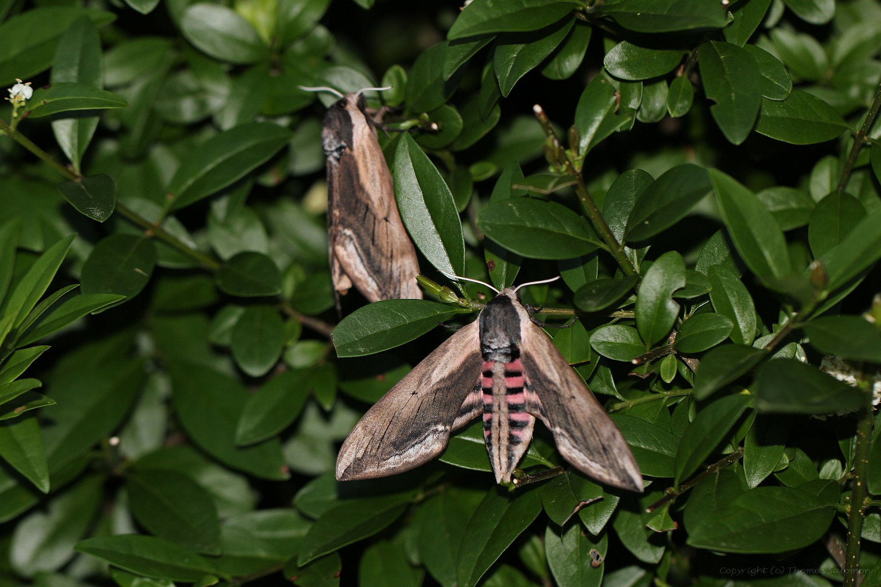 Zwei Ligusterschwärmer (Sphinx ligustri) in der Ligusterhecke vor der Paarung.