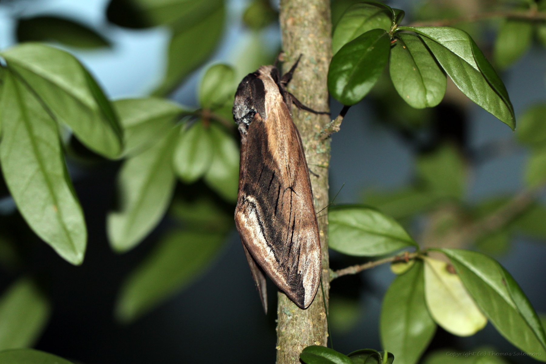 Der Ligusterschwärmer (Sphinx ligustri) hier abends aufgenommen in der Ligusterhecke mit Blitz.