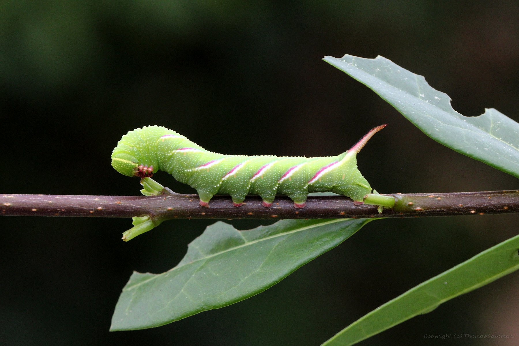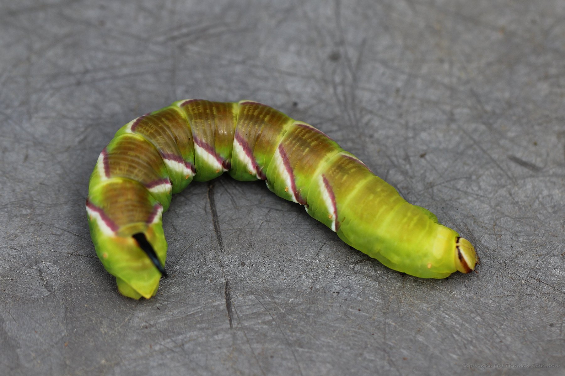 Die L3 Raupe des Ligusterschwärmers (Sphinx ligustri).