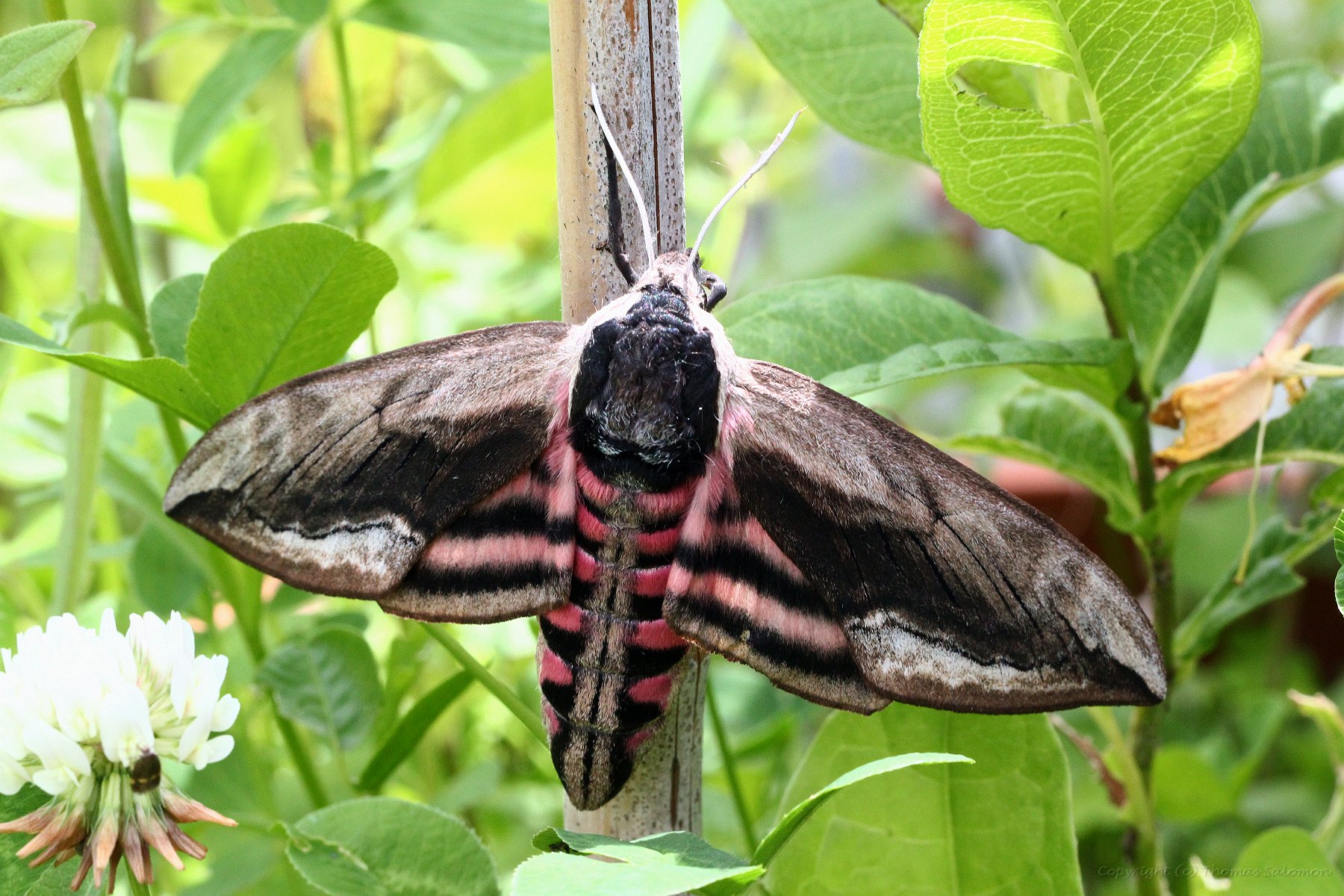 Der Ligusterschwärmer (Sphinx ligustri) - sehr schön ist der rot gestreifte Hinterleib und die Hinterflügel erkennbar.