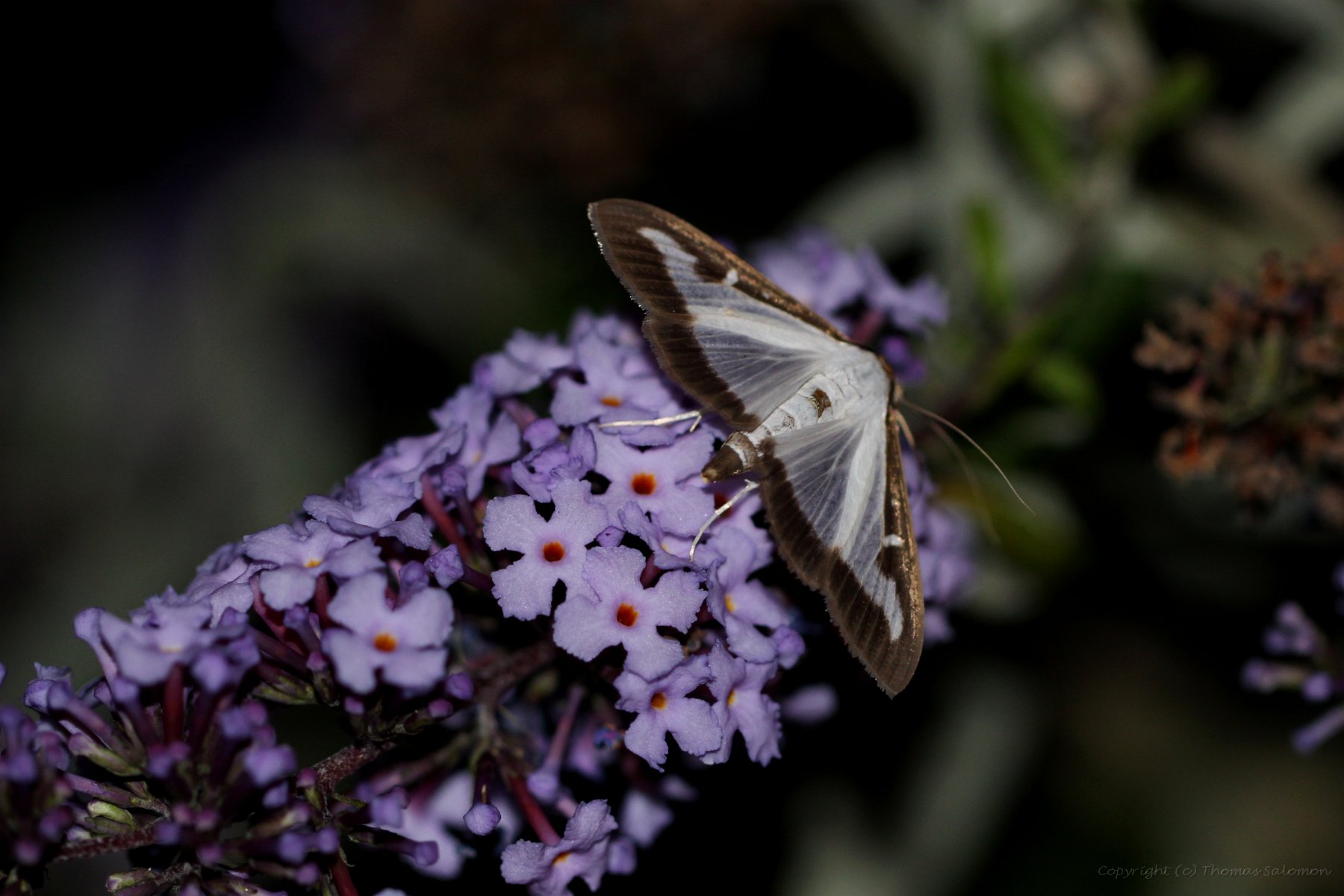 Ein Buchsbaum-Zünsler (Cydalima perspectalis, Weibchen) labt sich (leider) an unserem Sommerflieder.