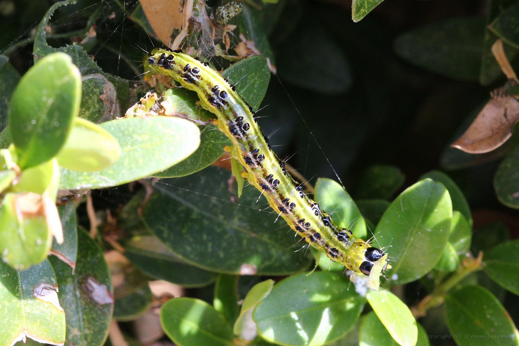 Das ist die gefräßige Raupe des Buchsbaum-Zünslers (Cydalima perspectalis)