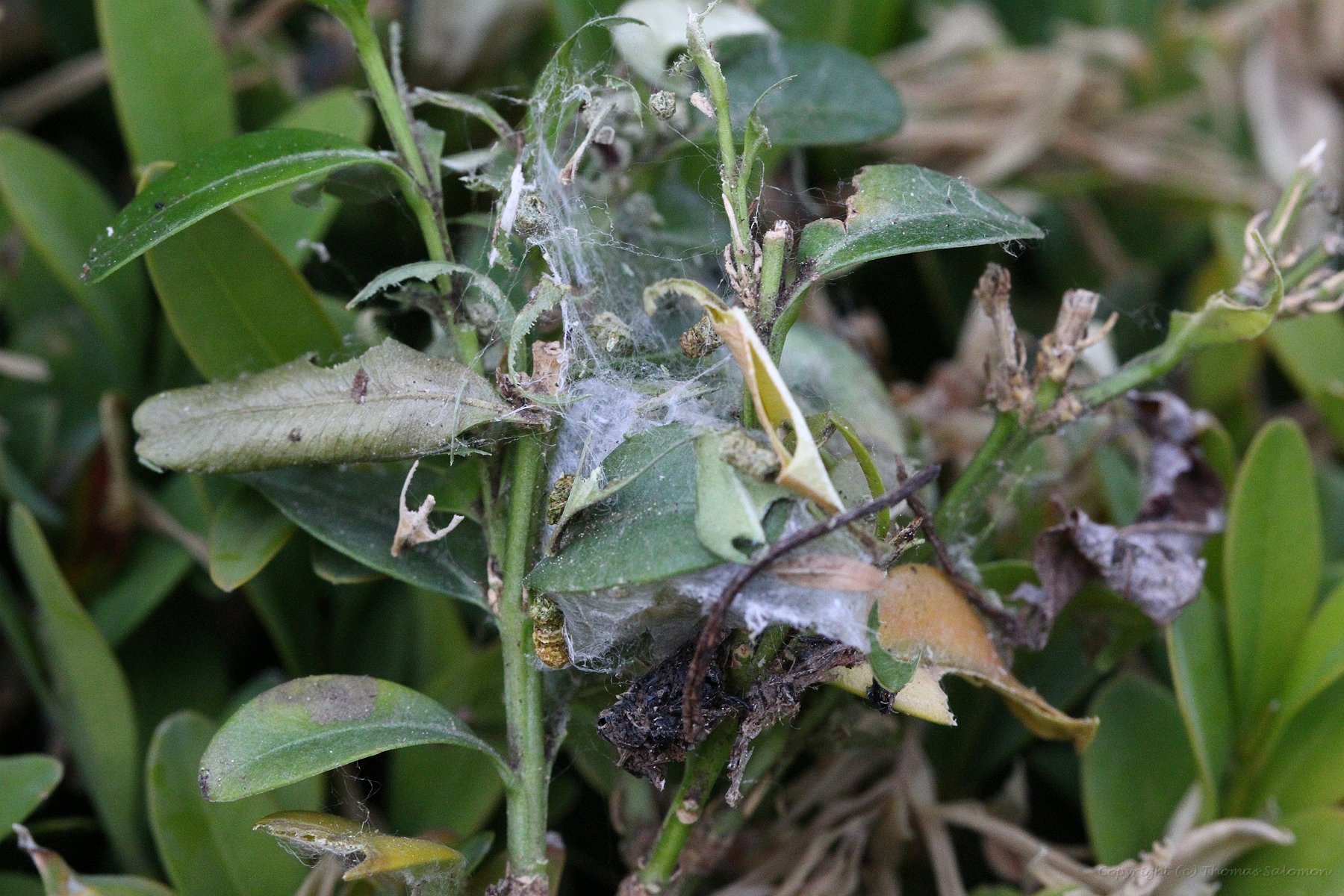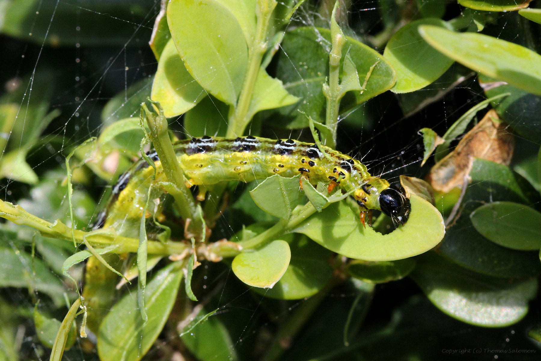 Die Raupe des Buchsbaum-Zünslers (Cydalima perspectalis) bei "der Arbeit". Anhand der Gespinstfäden kann man die Anwesenheit der Raupen leicht erkennen.