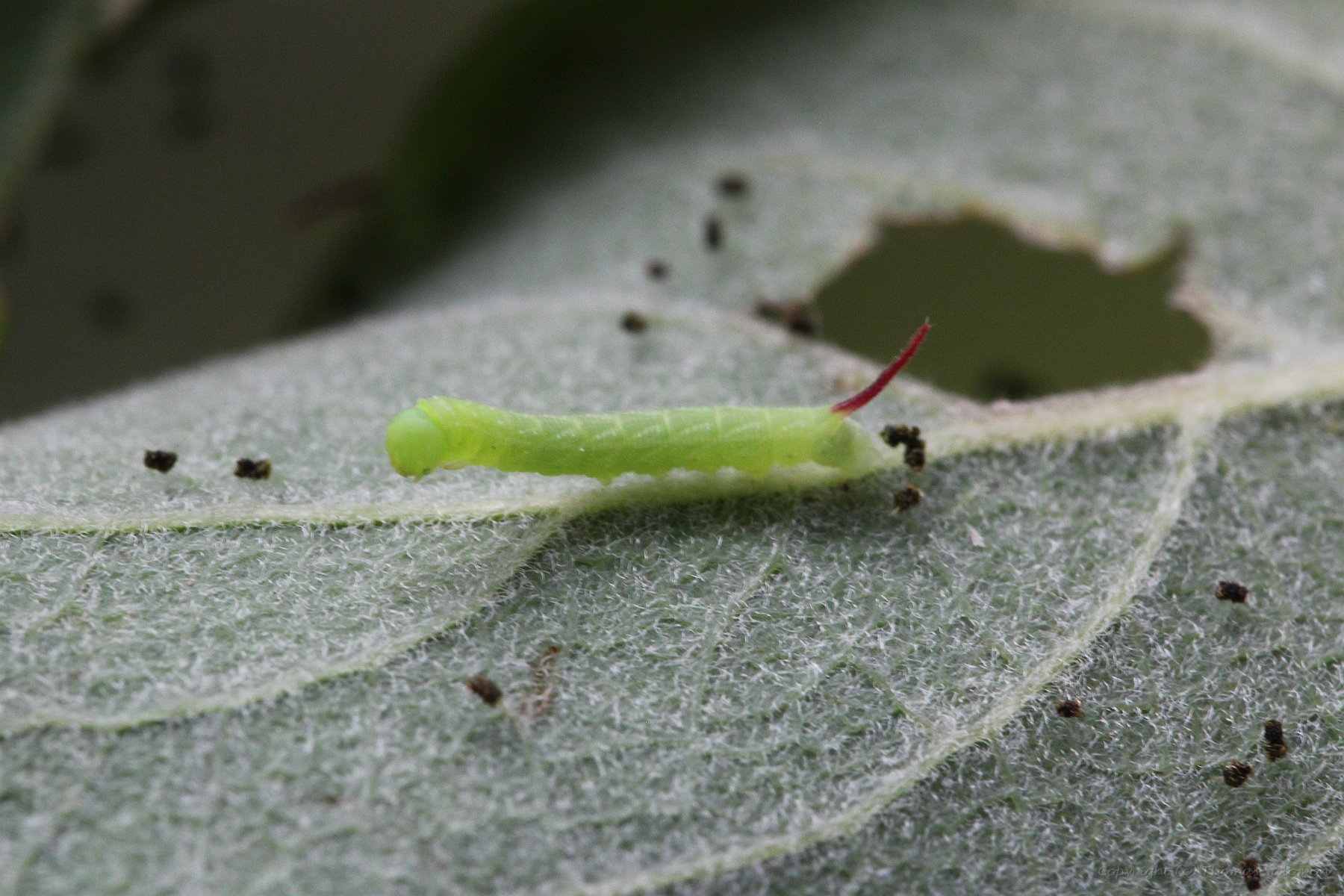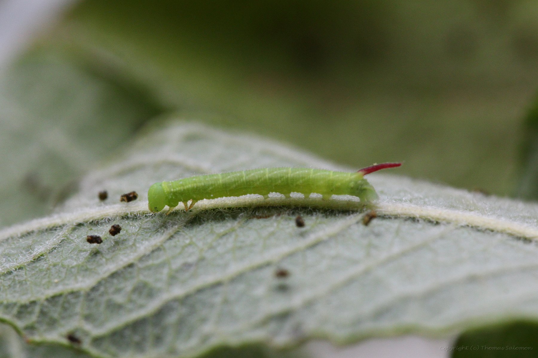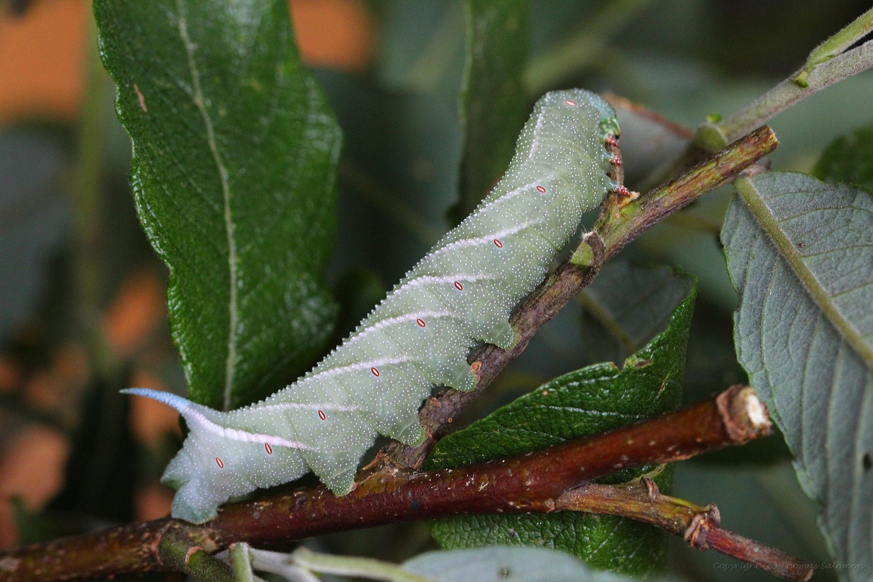 Ein Räupchen (L1) des Abendpfauenauges (Smerinthus ocellata) auf Salweide. Man sieht deutlich das in diesem Stadium überdimensionale, rote Analhorn.