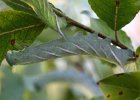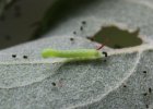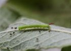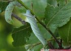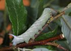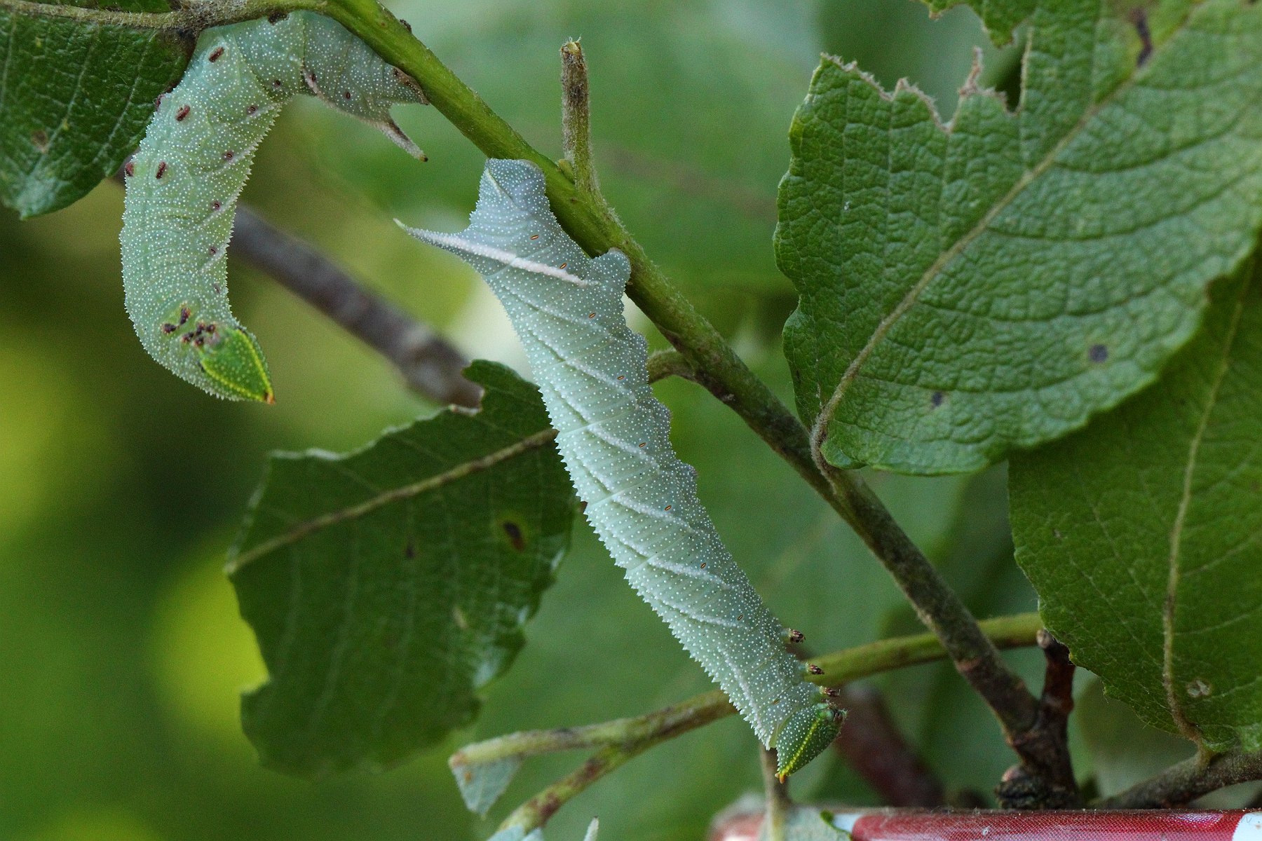 Nochmal eine fast ausgewachsene (daher helle) Raupe des Abendpfauenauges (Smerinthus ocellata) beim Fressen. Darüber ist eine etwas "grünere" Raupe zu erkennen.