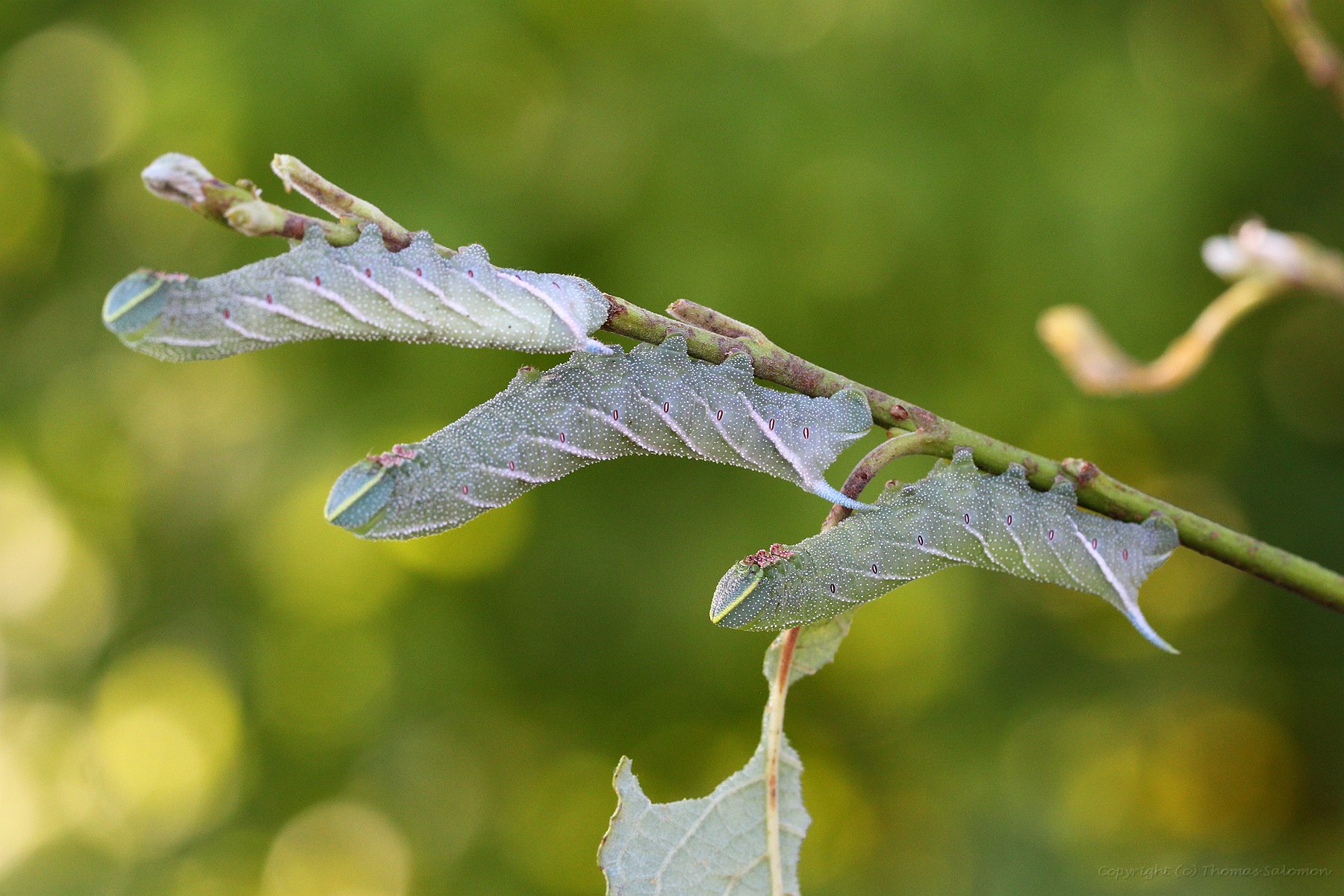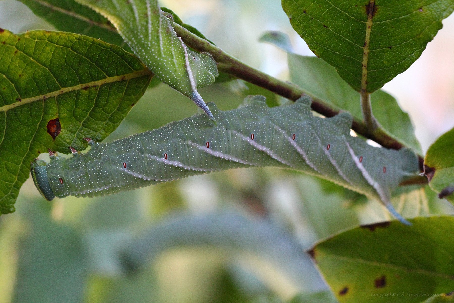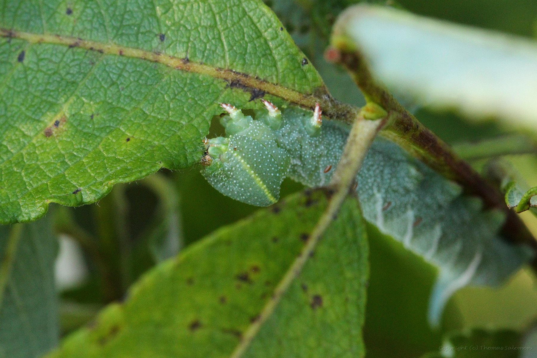 Eine Raupe des Abendpfauenauges (Smerinthus ocellata) beim Fressen an Salweide. Schön zu sehen, wie sie mit den Vorderbeinen das Blatt (oder besser sich selber) "festhält".