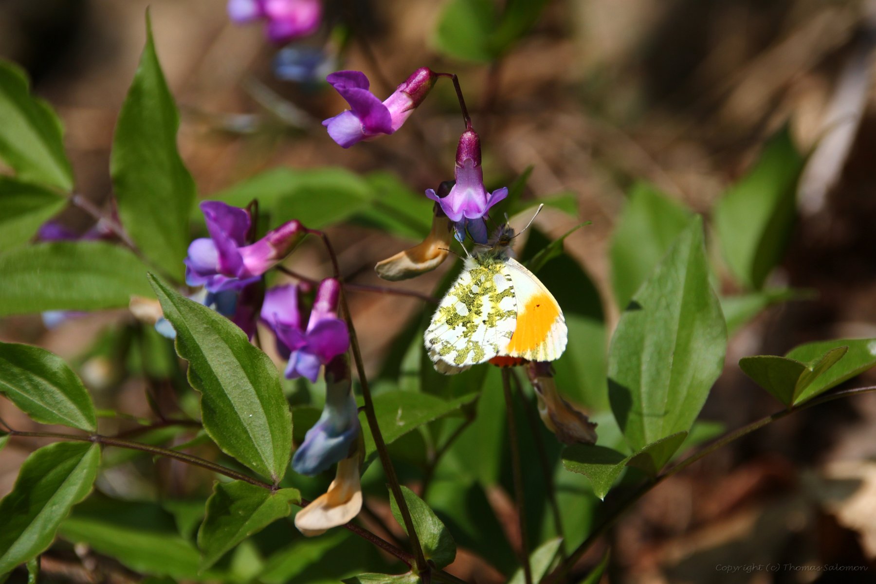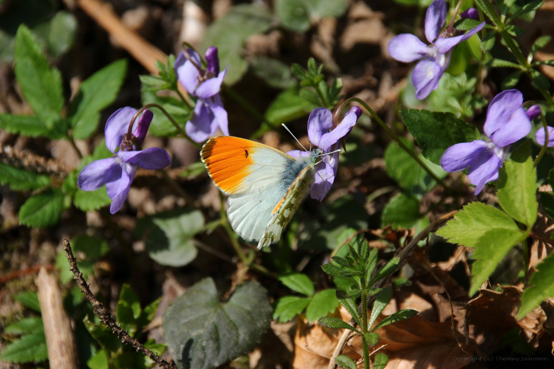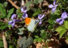 Ein männlicher Aurorafalter (Anthocharis Cardamines) beim Saugen an Veilchen; Frühlingstal, Kaltern (Südtirol, IT) |