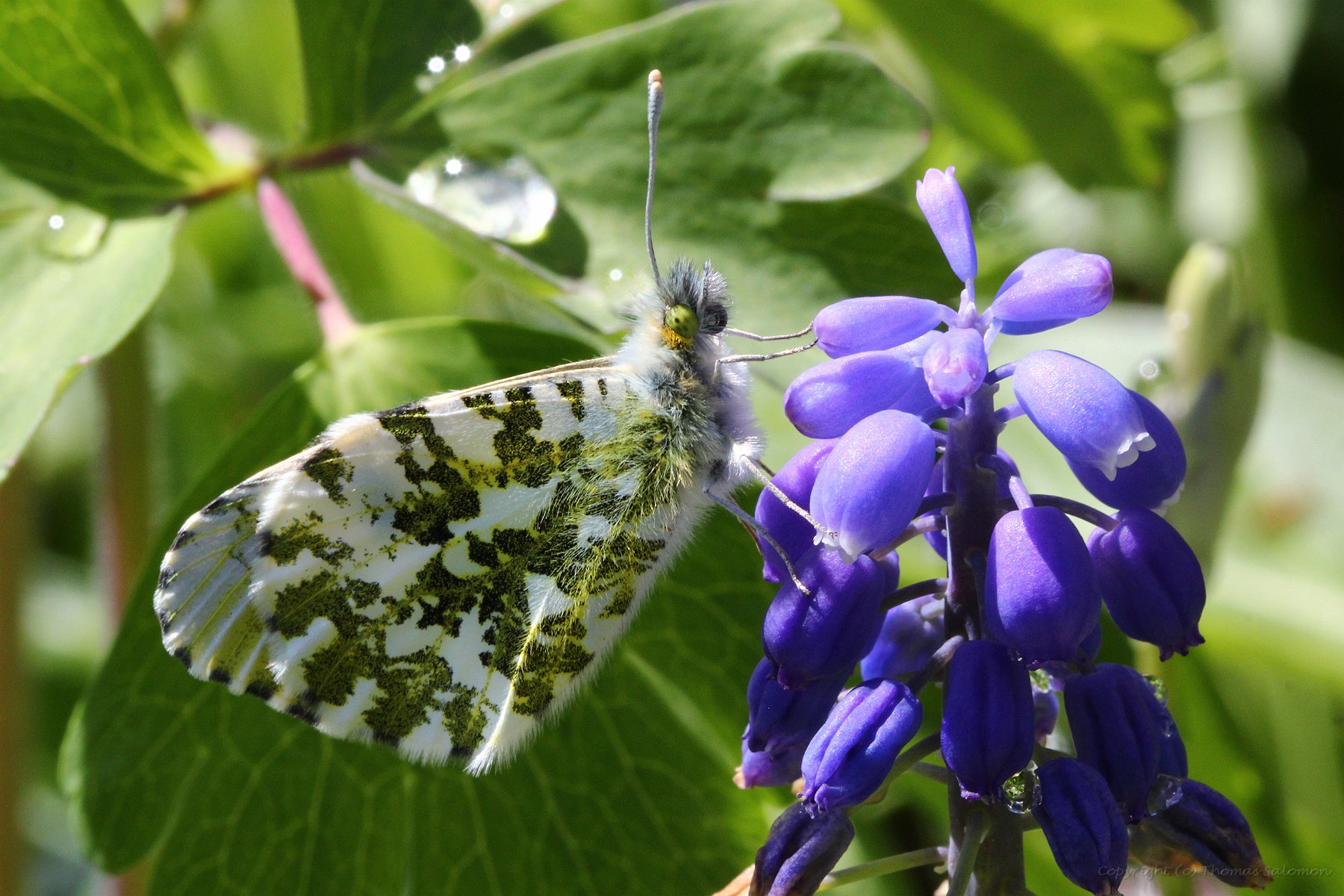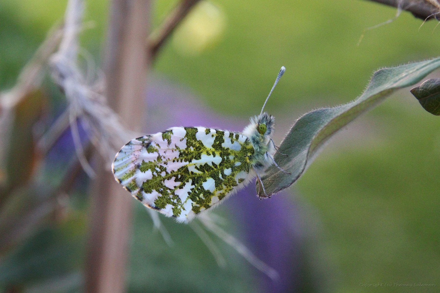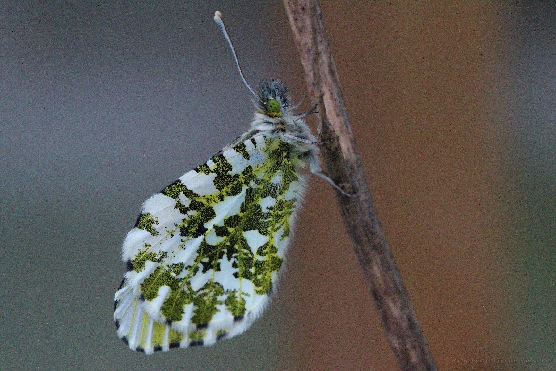 Ein frisch geschlüpfter weiblicher Aurorafalter (Anthocharis Cardamines). Schön zu sehen die schwarz-grünen Flecken auf der Flügelunterseite. |