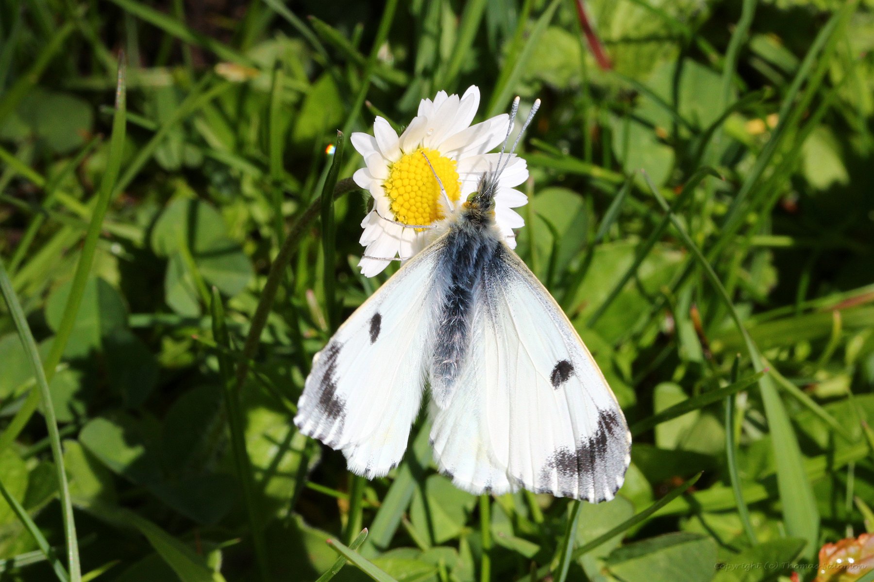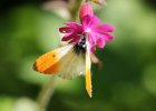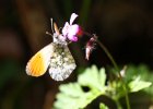 Der Autorafalter (Anthocharis Cardamines) beim Nektar-saugen. Deutlich sind die grünen Flecken an der Unterseite der Hinterflügel erkennbar. |