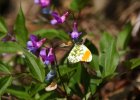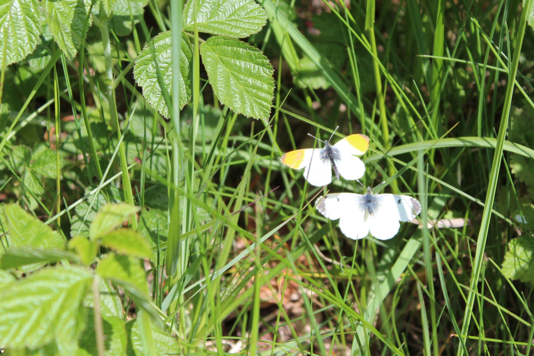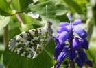 Ein Autorafalter-Päärchen (Anthocharis Cardamines) beim "Paarungsflug". Das Weibchen ist der Falter mit den grauen Flügelenden. |