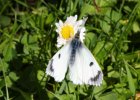 Ein weiblicher Aurorafalter (Anthocharis Cardamines). Das Weivhen erkennt man an der grau-weißen Oberseite der Flügel. |
