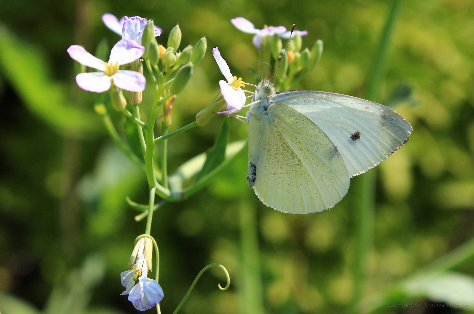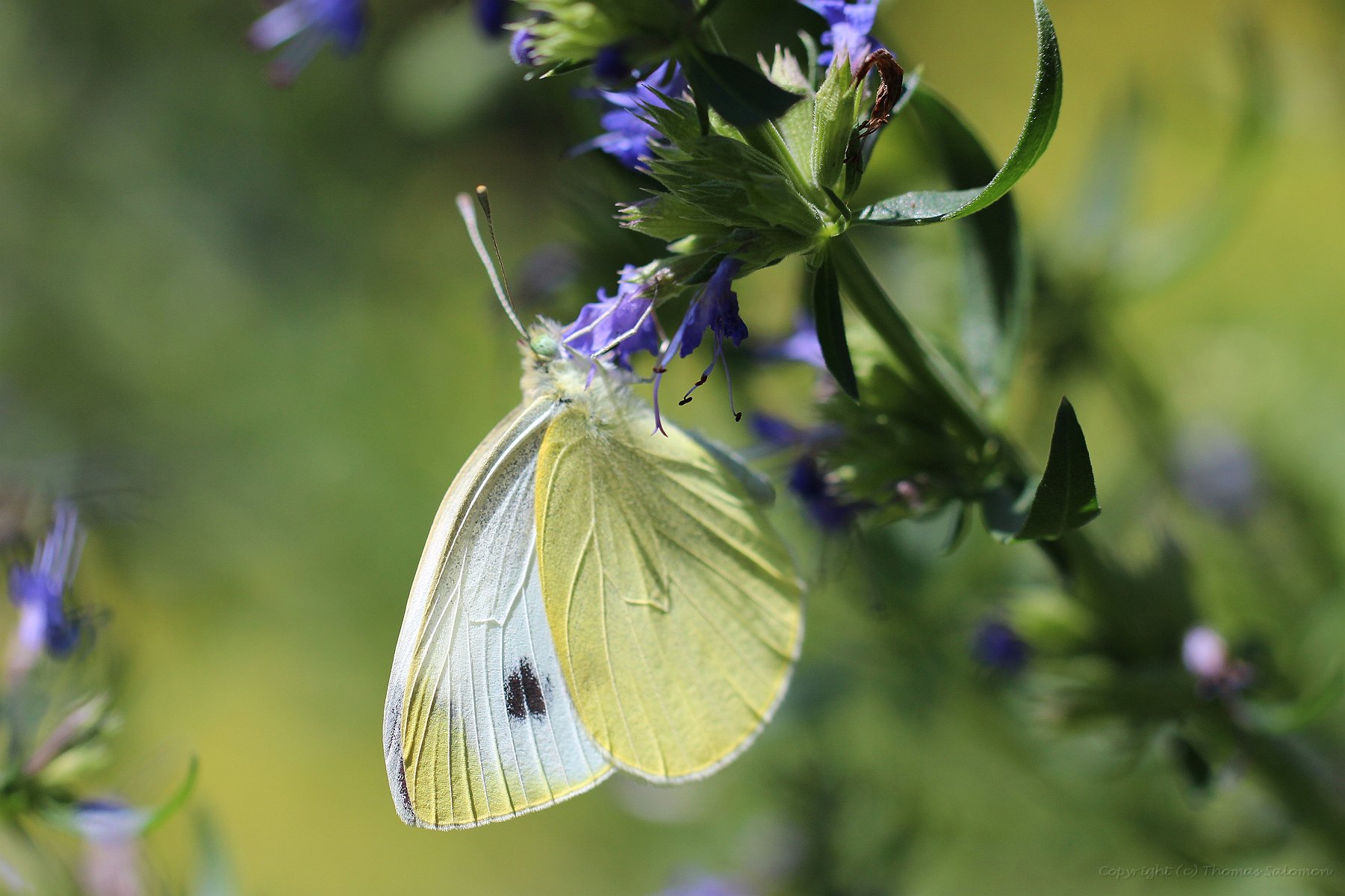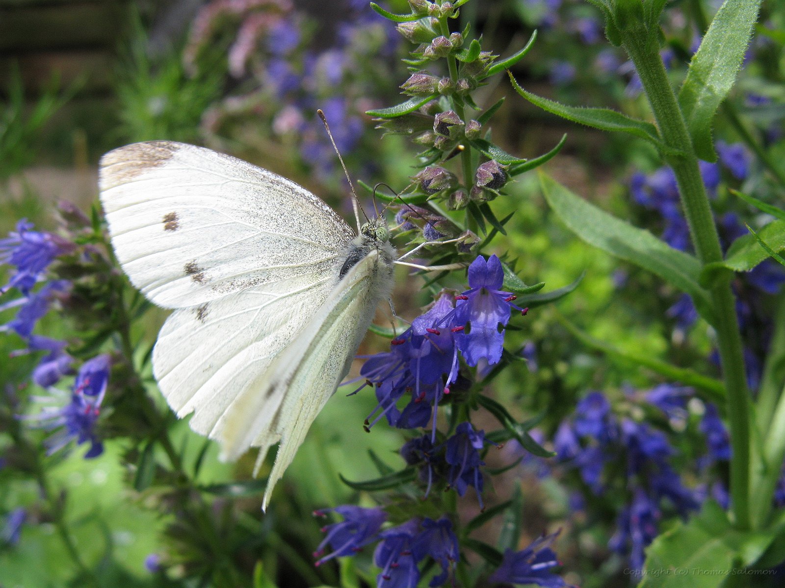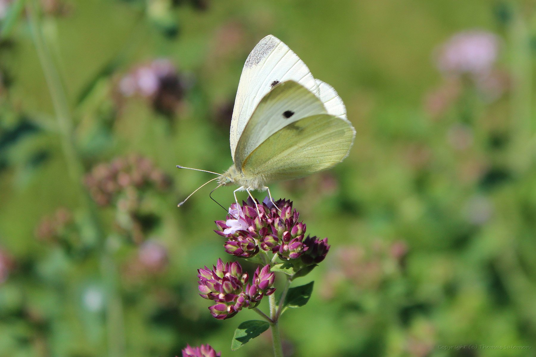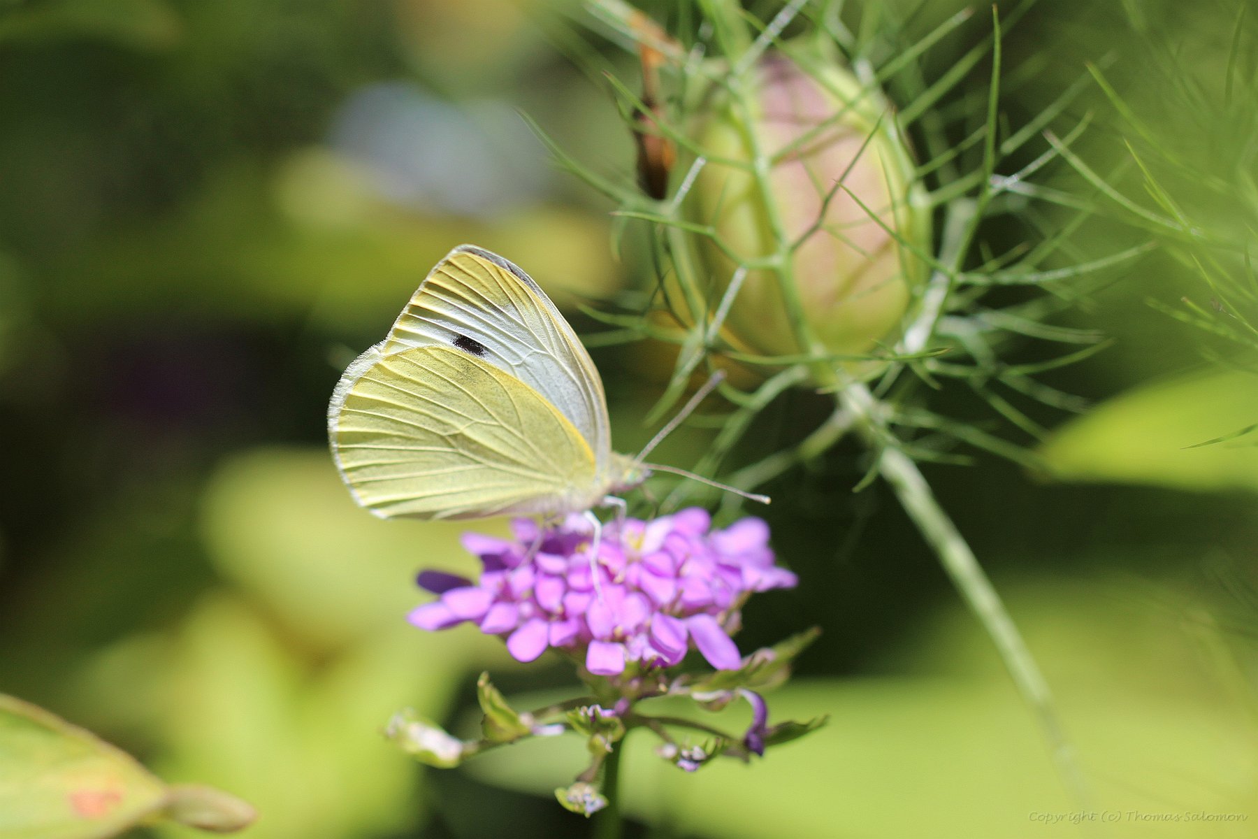 Dieser Kohlweißling (Pieris Brassicae) verschweindet fsat in den Blüten.