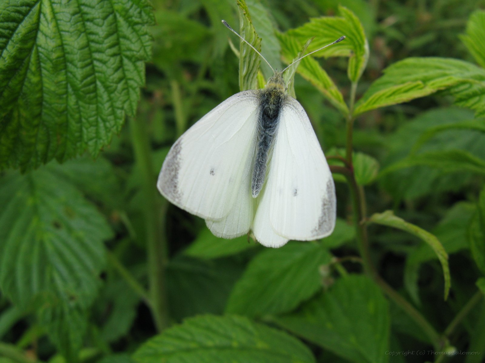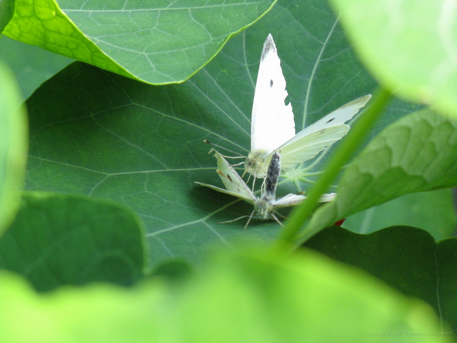 Das Weibchen von von Pieris Brassicae streckt den Hinerleib zur Begattung hoch.