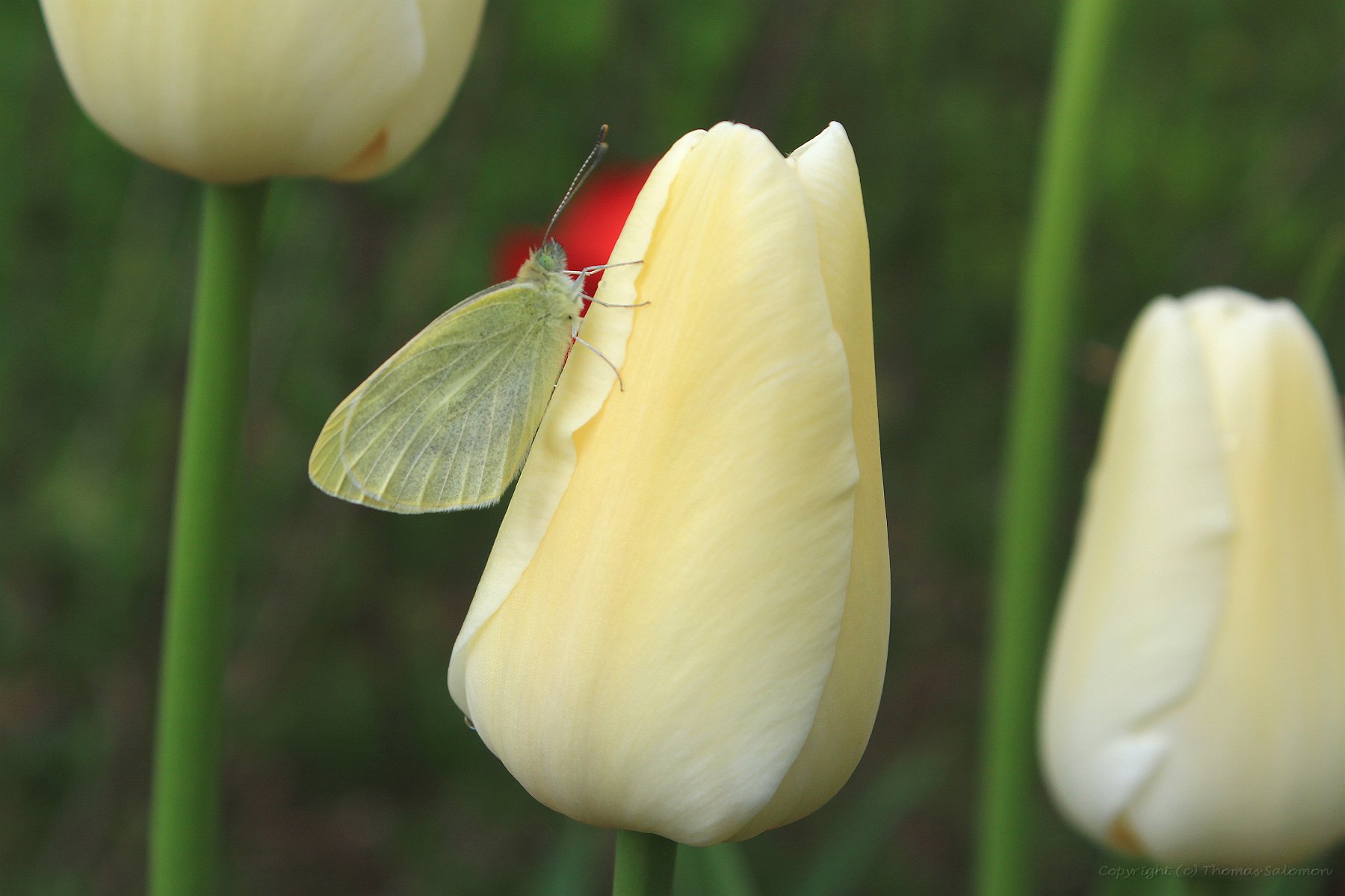 Pieris Rapae tarnt sich ein eine weißen Tulpe