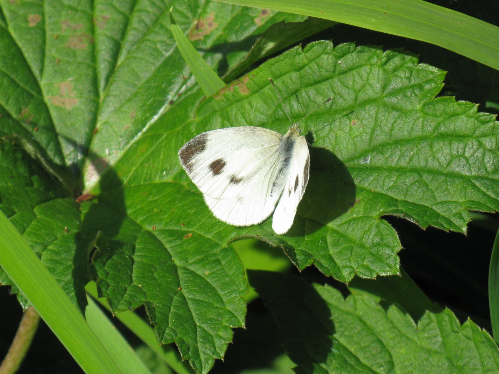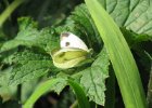 Ein Weibchen von Pieris rapae (kleiner Kohlweißling) bei der Eiablage. Deutlich kann man den Austritt des Ei's sehen.