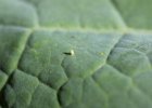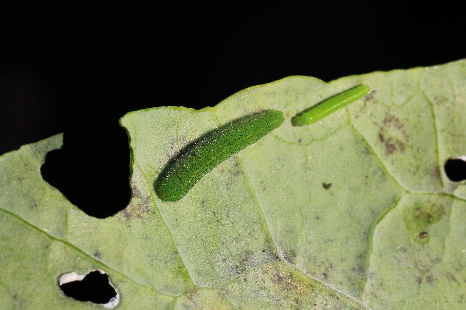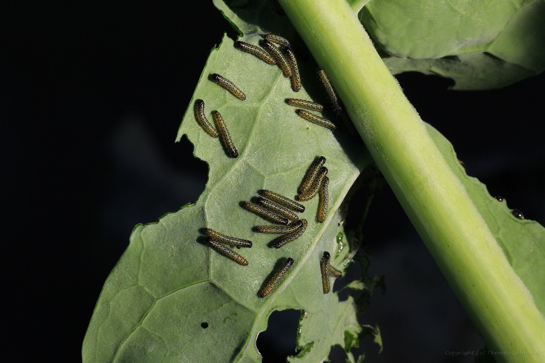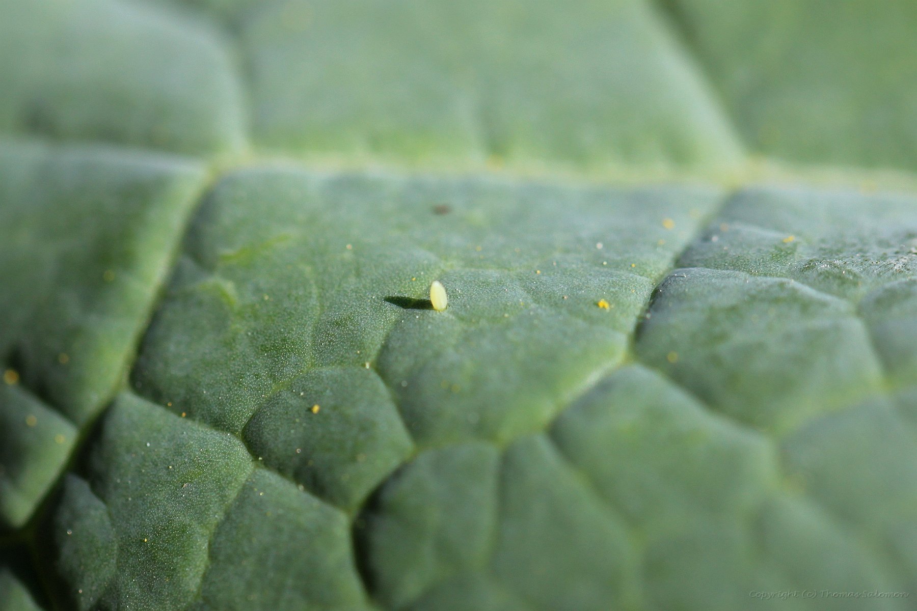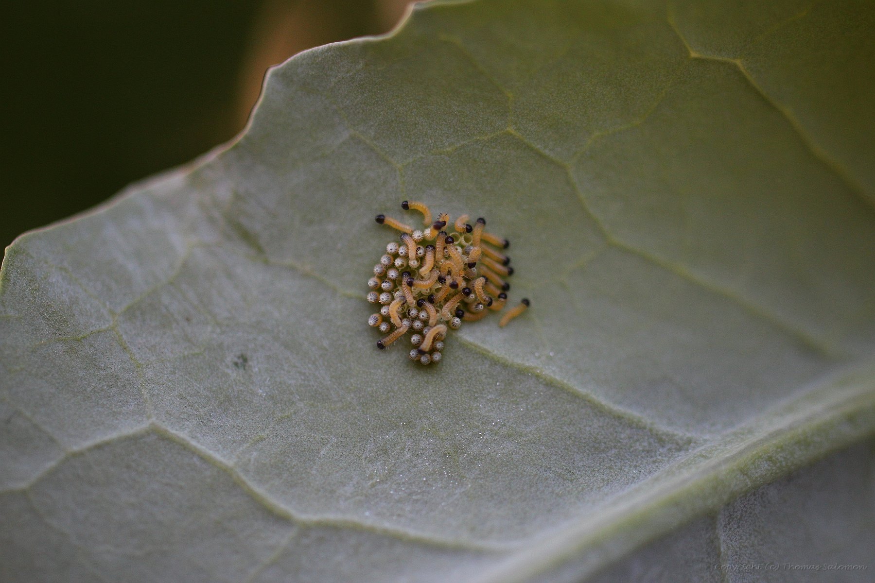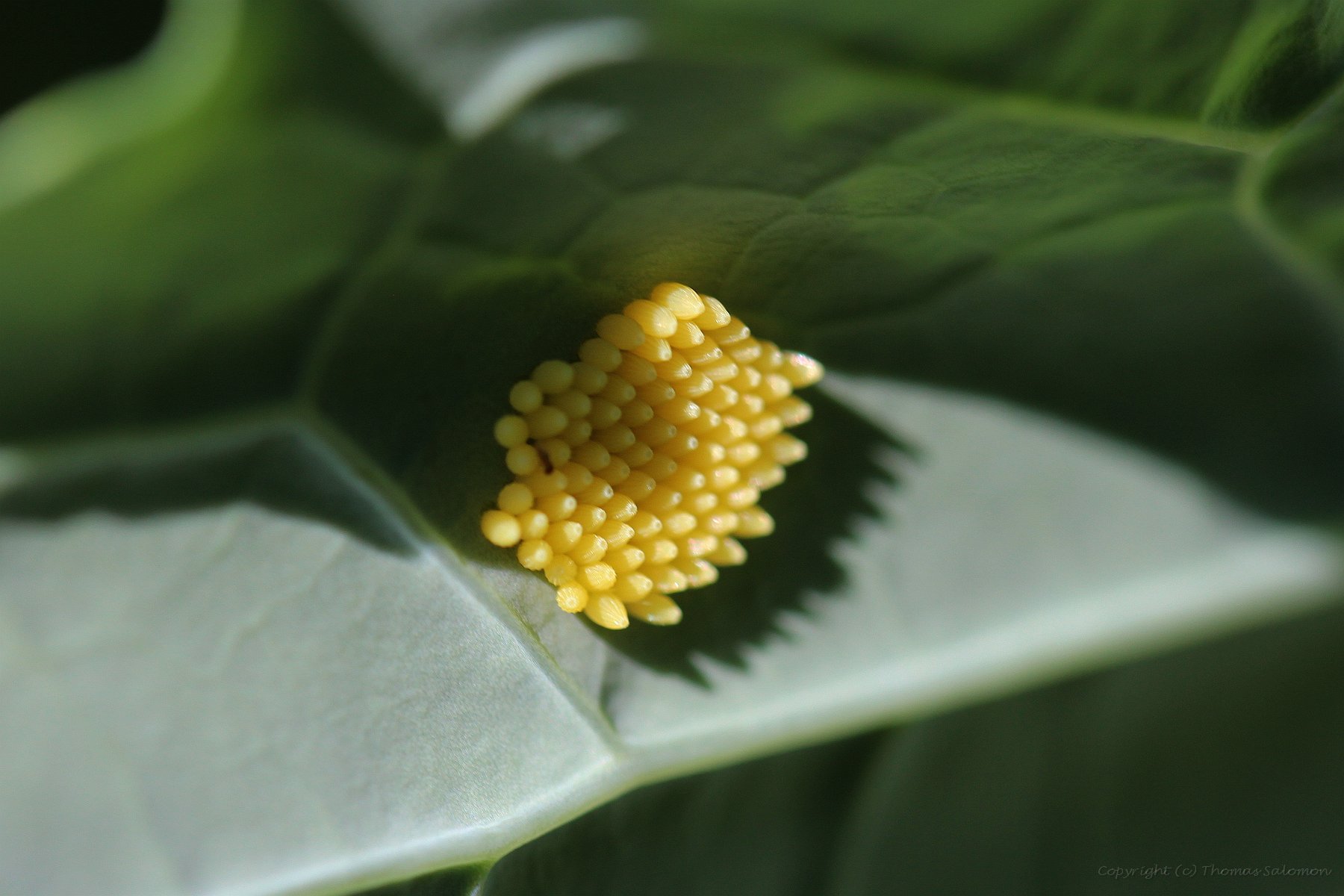 Eier und frisch geschlüpfte Räupchen von Pieris Brassicae. Als erste Nahung vertilgen die Kleinen ihre Eihülle, erst dann machen sie sich über das planzliche Futter her. Links eine ausgewachsene Raupe der gleichen Gattung, die im Verhältnis riesig ist.