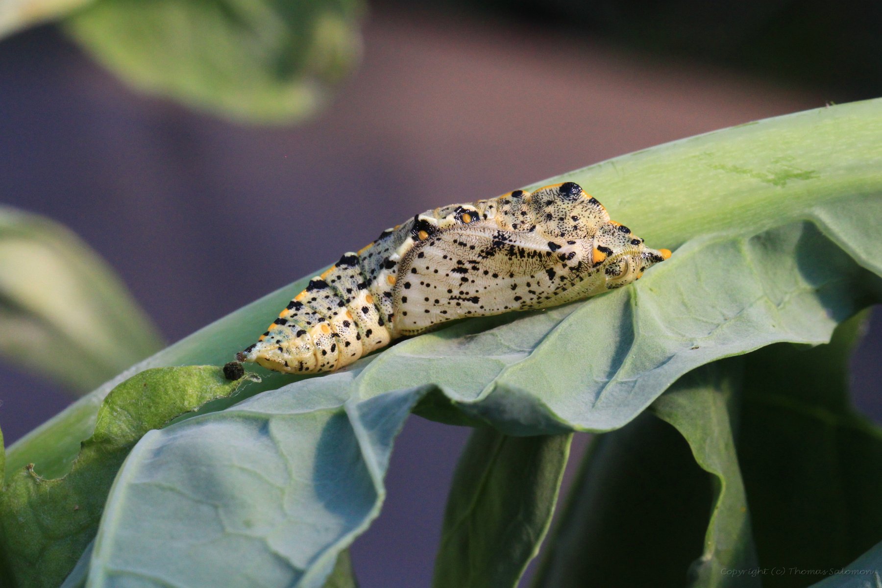 Die Puppe des großen Kohlweißlings an einem Kohlblatt