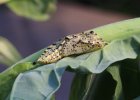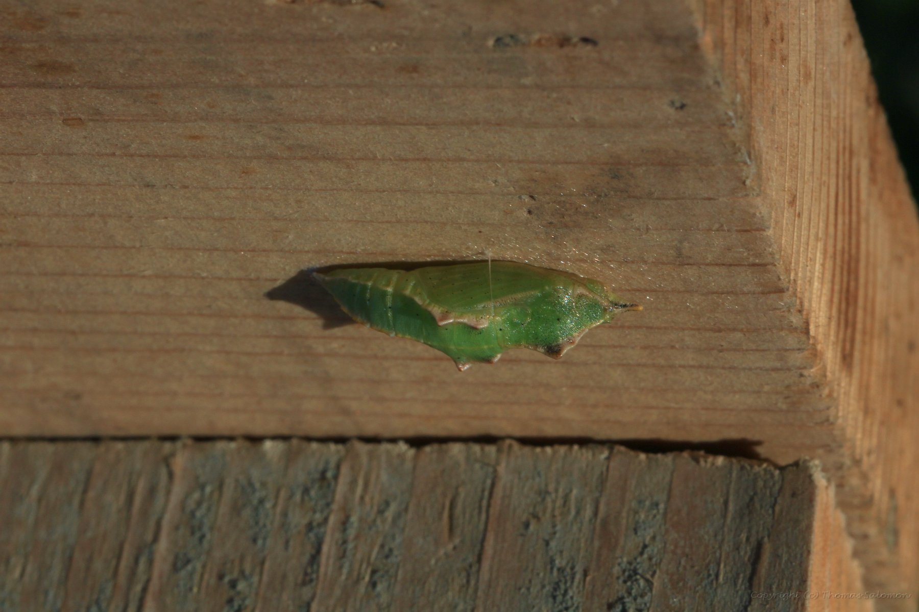Die Puppe von Pieris Rapae. Deutlich sieht man die Fäden, mit denen sich die Raupe am Holz befestigt hat.