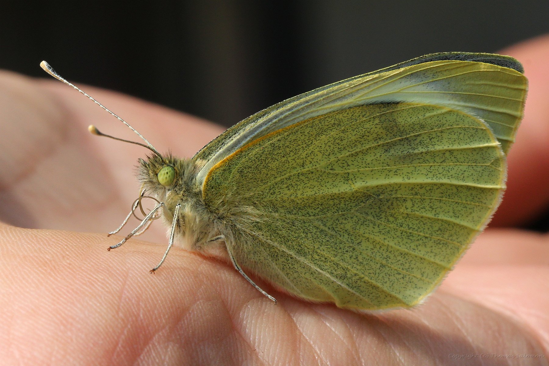 Ein frisch geschlüpftes Exemplar von Pieris Brassicae auf meiner Hand.