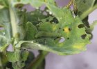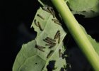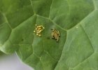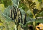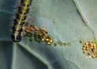 Räupchen großen Kohlweißlings (Pieris brassicae) - sind meist gesellig. Leider hat kein einziges überlebt: die Ameisen waren schneller.
